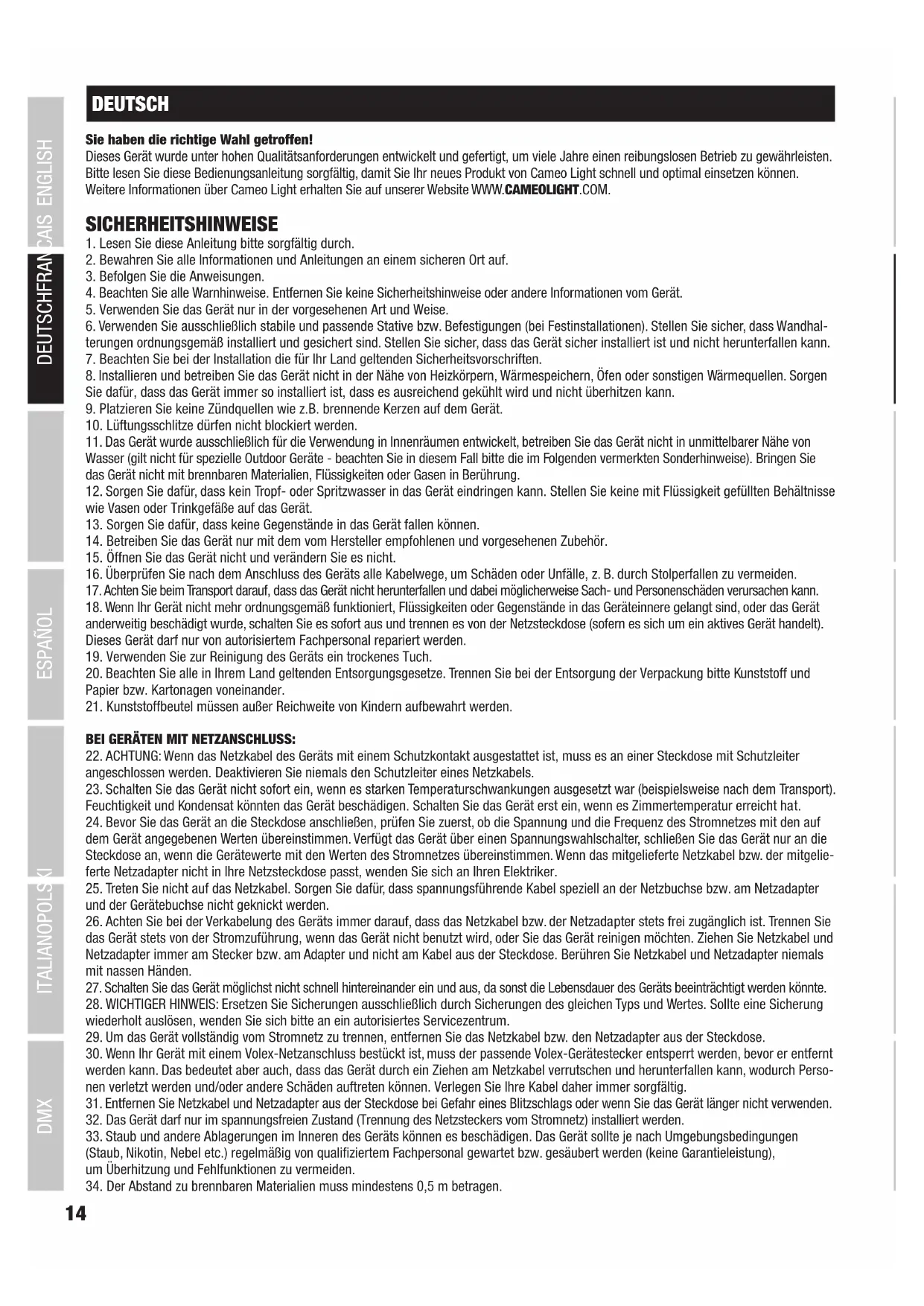 BEI GERÄTEN MIT NETZANSCHLUSS: 22. ACHTUNG: Wenn das Netzkabel des Geräts mit einem Schutzkontakt ausgestattet ist, muss es an einer Steckdose mit Schutzleiter angeschlossen werden. Deaktivieren Sie niemals den Schutzleiter eines Netzkabels. 23. Schalten Sie das Gerät nicht sofort ein, wenn es starken Temperaturschwankungen ausgesetzt war (beispielsweise nach dem Transport). Feuchtigkeit und Kondensat könnten das Gerät beschädigen. Schalten Sie das Gerät erst ein, wenn es Zimmertemperatur erreicht hat. 24. Bevor Sie das Gerät an die Steckdose anschließen, prüfen Sie zuerst, ob die Spannung und die Frequenz des Stromnetzes mit den auf dem Gerät angegebenen Werten übereinstimmen. Verfügt das Gerät über einen Spannungswahlschalter, schließen Sie das Gerät nur an die Steckdose an, wenn die Gerätewerte mit den Werten des Stromnetzes übereinstimmen. Wenn das mitgelieferte Netzkabel bzw. der mitgelie- ferte Netzadapter nicht in Ihre Netzsteckdose passt, wenden Sie sich an Ihren Elektriker. 25. Treten Sie nicht auf das Netzkabel. Sorgen Sie dafür, dass spannungsführende Kabel speziell an der Netzbuchse bzw. am Netzadapter und der Gerätebuchse nicht geknickt werden. 26. Achten Sie bei der Verkabelung des Geräts immer darauf, dass das Netzkabel bzw. der Netzadapter stets frei zugänglich ist. Trennen Sie das Gerät stets von der Stromzuführung, wenn das Gerät nicht benutzt wird, oder Sie das Gerät reinigen möchten. Ziehen Sie Netzkabel und Netzadapter immer am Stecker bzw. am Adapter und nicht am Kabel aus der Steckdose. Berühren Sie Netzkabel und Netzadapter niemals mit nassen Händen. 27. Schalten Sie das Gerät möglichst nicht schnell hintereinander ein und aus, da sonst die Lebensdauer des Geräts beeinträchtigt werden könnte. 28. WICHTIGER HINWEIS: Ersetzen Sie Sicherungen ausschließlich durch Sicherungen des gleichen Typs und Wertes. Sollte eine Sicherung wiederholt auslösen, wenden Sie sich bitte an ein autorisiertes Servicezentrum. 29. Um das Gerät vollständig vom Stromnetz zu trennen, entfernen Sie das Netzkabel bzw. den Netzadapter aus der Steckdose. 30. Wenn Ihr Gerät mit einem Volex-Netzanschluss bestückt ist, muss der passende Volex-Gerätestecker entsperrt werden, bevor er entfernt werden kann. Das bedeutet aber auch, dass das Gerät durch ein Ziehen am Netzkabel verrutschen und herunterfallen kann, wodurch Perso- nen verletzt werden und/oder andere Schäden auftreten können. Verlegen Sie Ihre Kabel daher immer sorgfältig. 31. Entfernen Sie Netzkabel und Netzadapter aus der Steckdose bei Gefahr eines Blitzschlags oder wenn Sie das Gerät länger nicht verwenden.