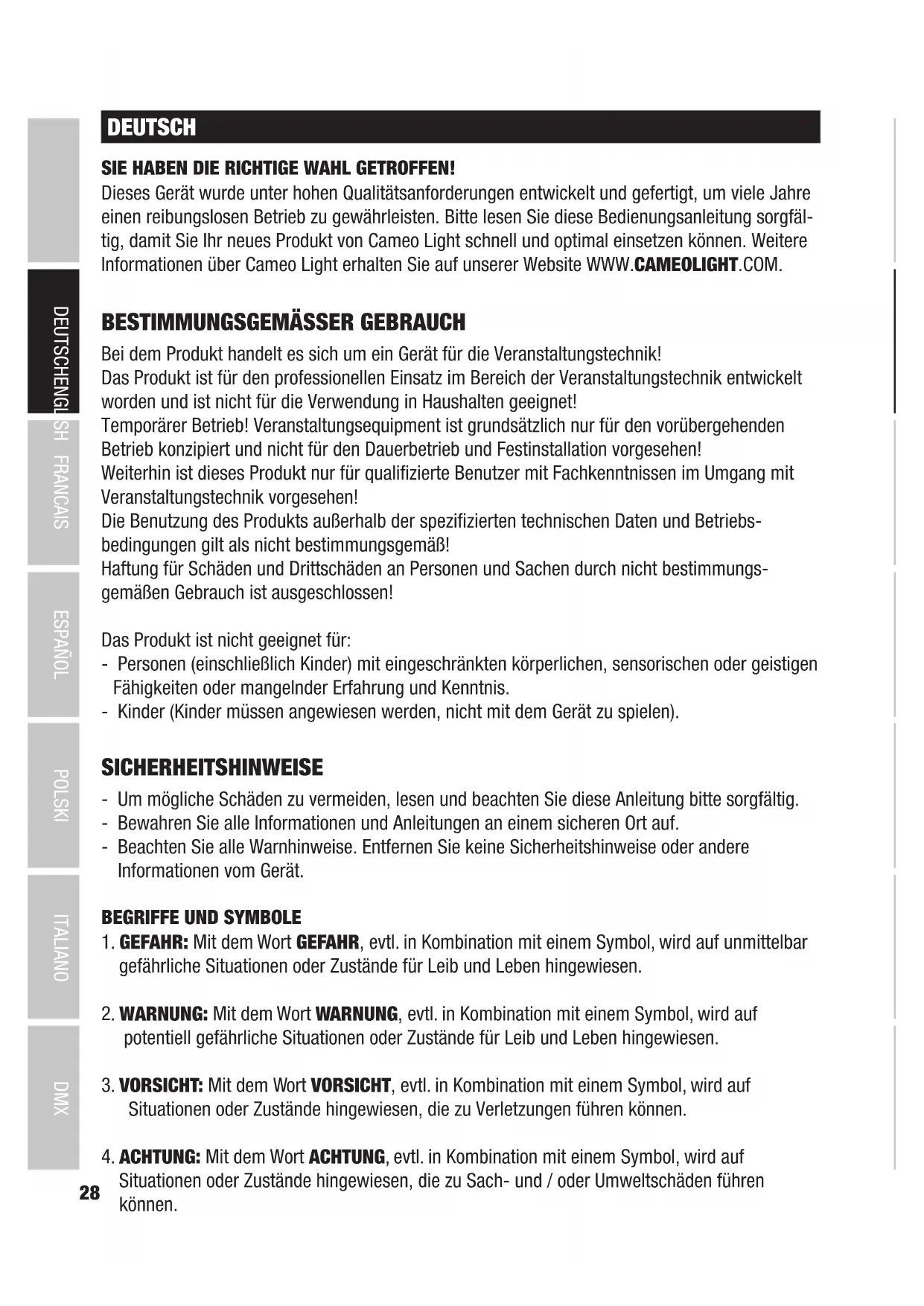 Adam Hall GmbH, Adam-Hall-Str. 1, D-61267 Neu Anspach / E-Mail Info@adamhall.com / +49 (0)6081 / 9419-0. Unsere aktuellen Garantiebedingungen und Haftungsbeschränkung finden Sie unter: https://cdn-shop.adamhall.com/media/pdf/Manufacturers-Declarations-CAMEO_DE_EN_ES_FR.pdf. Im Servicefall wenden Sie sich an Ihren Vertriebspartner. CE-KONFORMITÄT Hiermit erklärt die Adam Hall GmbH, dass dieses Produkt folgenden Richtlinien entspricht (soweit zutreffend): R&TTE (1999/5/EG) bzw. RED (2014/53/EU) ab Juni 2017 Niederspannungsrichtlinie (2014/35/EU) EMV-Richtlinie (2014/30/EU) RoHS (2011/65/EU) Die vollständige Konformitätserklärung finden Sie unter www.adamhall.com. Des Weiteren können Sie diese auch unter info@adamhall.com anfragen. DRUCKFEHLER UND IRRTÜMER, SOWIE TECHNISCHE ODER SONSTIGE ÄNDERUNGEN SIND VORBEHALTEN!55 DMX DEUTSCHFRANCAIS ESPAÑOL ENGLISH ITALIANO POLSKI FRANÇAIS VOUS AVEZ FAIT LE BON CHOIX! Cet appareil a été développé et fabriqué en appliquant des exigences de qualité très élevées: il garantit des années de fonctionnement sans problème.Veuillez lire attentivement ce Manuel Utilisateur: vous apprendrez rapidement à utiliser votre appareil Cameo Light de façon optimale. Vous trouverez davantage d‘informations à propos de Cameo Light sur notre site Web: WWW.CAMEOLIGHT.COM.