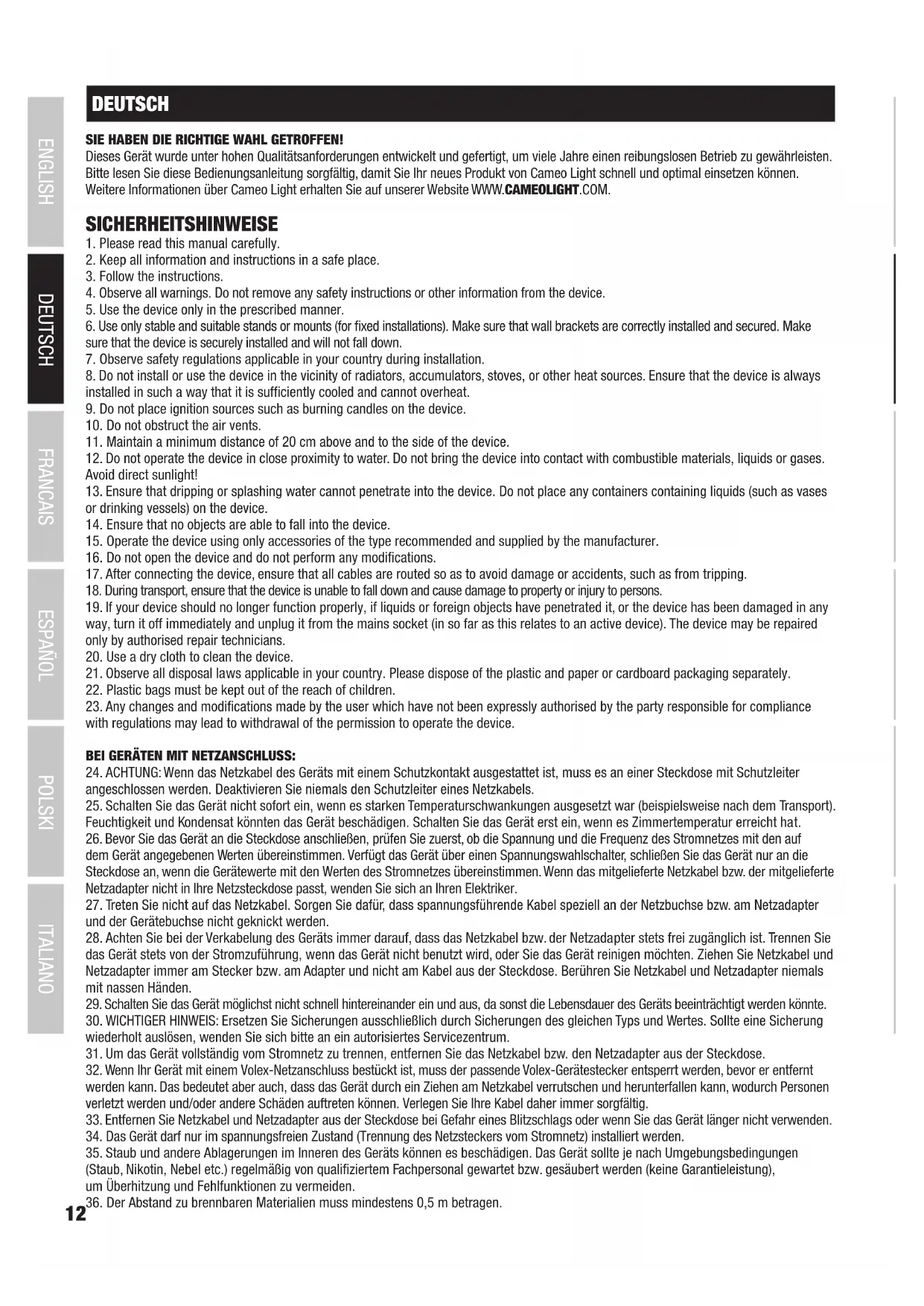 (Gültig in der Europäischen Union und anderen europäischen Ländern mit Mülltrennung) Dieses Symbol auf dem Produkt oder dazugehörigen Dokumenten weist darauf hin, dass das Gerät am Ende der Produktlebenszeit nicht zusammen mit dem normalen Hausmüll entsorgt werden darf, um Umwelt- oder Personenschäden durch unkontrollierte Abfallentsorgung zu vermeiden. Bitte entsorgen Sie dieses Produkt getrennt von anderen Abfällen und führen es zur Förderung nachhaltiger Wirtschaftskreisläufe dem Recycling zu. Als Pri- vatkunde erhalten Sie Informationen zu umweltfreundlichen Entsorgungsmöglichkeiten über den Händler, bei dem das Produkt erwor¬ben wurde, oder über die entsprechenden regionalen Behörden. Als gewerblicher Nutzer kontaktieren Sie bitte Ihren Lieferanten und prüfen die ggf. vertraglich vereinbarten Konditionen zur Entsorgung der Geräte. Dieses Produkt darf nicht zusammen mit anderen gewerblichen Abfällen entsorgt werden. CE-Konformität Hiermit erklärt die Adam Hall GmbH, dass dieses Produkt folgenden Richtlinien entspricht (soweit zutreffend): R&TTE (1999/5/EG) bzw. RED (2014/53/EU) ab Juni 2017 Niederspannungsrichtlinie (2014/35/EU) EMV-Richtlinie (2014/30/EU) RoHS (2011/65/EU) Die vollständige Konformitätserklärung finden Sie unter www.adamhall.com. Des Weiteren können Sie diese auch unter info@adamhall.com anfragen.21 DEUTSCHFRANCAIS ESPAÑOL ENGLISH ITALIANO POLSKI ITALIANO POLSKI ESPAÑOL FRANCAIS DEUTSCH ENGLISH DEUTSCHFRANCAIS ESPAÑOL ENGLISH ITALIANO POLSKI ITALIANO POLSKI ESPAÑOL FRANCAIS DEUTSCH ENGLISH FRANCAIS Vous avez fait le bon choix! Cet appareil a été développé et fabriqué en appliquant des exigences de qualité très élevées: il garantit des années de fonctionnement sans problème.Veuillez lire attentivement ce Manuel Utilisateur : vous apprendrez rapidement à utiliser votre appareil Cameo Light de façon optimale. Vous trouverez davantage d‘informations à propos de Cameo Light sur notre site Web: WWW.CAMEOLIGHT.COM.