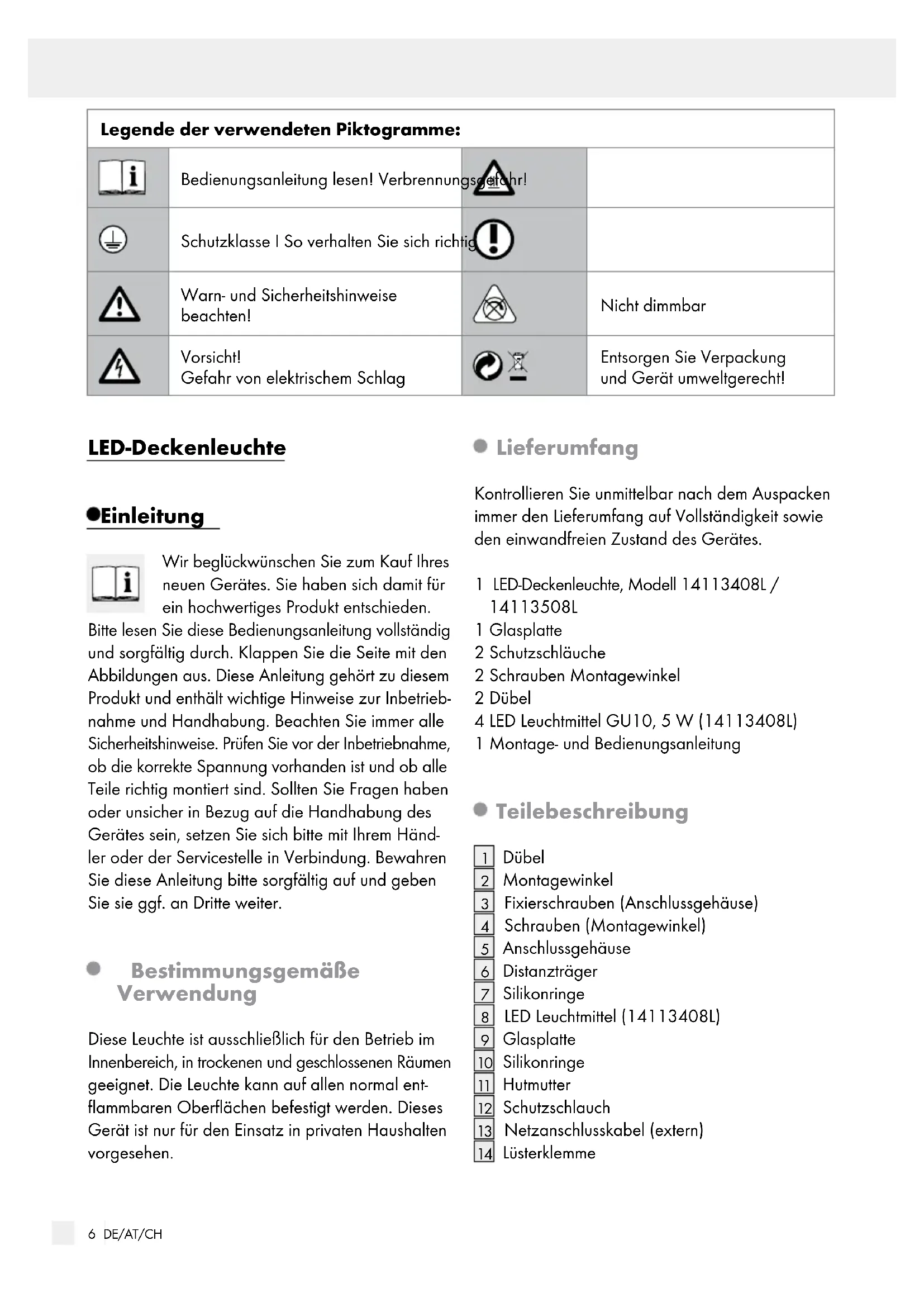 115 DE/AT/CH Inhaltsverzeichnis Legende der verwendeten Piktogramme ........................................................... Seite 6 Einleitung ......................................................................................................................................... Seite 6 Bestimmungsgemäße Verwendung ....................................................................................................Seite 6 Lieferumfang ........................................................................................................................................ Seite 6 Teilebeschreibung ...............................................................................................................................Seite 6 Technische Daten ................................................................................................................................Seite 7 Sicherheit ......................................................................................................................................... Seite 7 Sicherheitshinweise .............................................................................................................................Seite 7 Vorbereitung ................................................................................................................................Seite 8 Benötigtes Werkzeug und Material ...................................................................................................Seite 8 Vor der Installation .................................................................................................................Seite 8 Inbetriebnahme ......................................................................................................................... Seite 8 Leuchte montieren ...............................................................................................................................Seite 8 Leuchtmittel wechseln ..........................................................................................................................Seite 9 Wartung und Reinigung .....................................................................................................Seite 9 Entsorgung .....................................................................................................................................Seite 10 Garantie und Service ............................................................................................................Seite 10 Garantieerklärung ...............................................................................................................................Seite 10 Serviceadresse ....................................................................................................................................Seite 10 Konformitätserklärung .........................................................................................................................Seite 10 Hersteller ..............................................................................................................................................Seite 106 DE/AT/CH Einleitung / SicherheitEinleitung LED-Deckenleuchte Einleitung Wir beglückwünschen Sie zum Kauf Ihres neuen Gerätes. Sie haben sich damit für ein hochwertiges Produkt entschieden. Bitte lesen Sie diese Bedienungsanleitung vollständig und sorgfältig durch. Klappen Sie die Seite mit den Abbildungen aus. Diese Anleitung gehört zu diesem Produkt und enthält wichtige Hinweise zur Inbetrieb- nahme und Handhabung. Beachten Sie immer alle Sicherheitshinweise. Prüfen Sie vor der Inbetriebnahme, ob die korrekte Spannung vorhanden ist und ob alle Teile richtig montiert sind. Sollten Sie Fragen haben oder unsicher in Bezug auf die Handhabung des Gerätes sein, setzen Sie sich bitte mit Ihrem Händ- ler oder der Servicestelle in Verbindung. Bewahren Sie diese Anleitung bitte sorgfältig auf und geben Sie sie ggf. an Dritte weiter. Bestimmungsgemäße Verwendung Diese Leuchte ist ausschließlich für den Betrieb im Innenbereich, in trockenen und geschlossenen Räumen geeignet. Die Leuchte kann auf allen normal ent- flammbaren Oberflächen befestigt werden. Dieses Gerät ist nur für den Einsatz in privaten Haushalten vorgesehen. Lieferumfang Kontrollieren Sie unmittelbar nach dem Auspacken immer den Lieferumfang auf Vollständigkeit sowie den einwandfreien Zustand des Gerätes. 1 LED-Deckenleuchte, Modell 14113408L / 14113508L 1 Glasplatte 2 Schutzschläuche 2 Schrauben Montagewinkel 2 Dübel 4 LED Leuchtmittel GU10, 5 W (14113408L) 1 Montage- und Bedienungsanleitung Teilebeschreibung