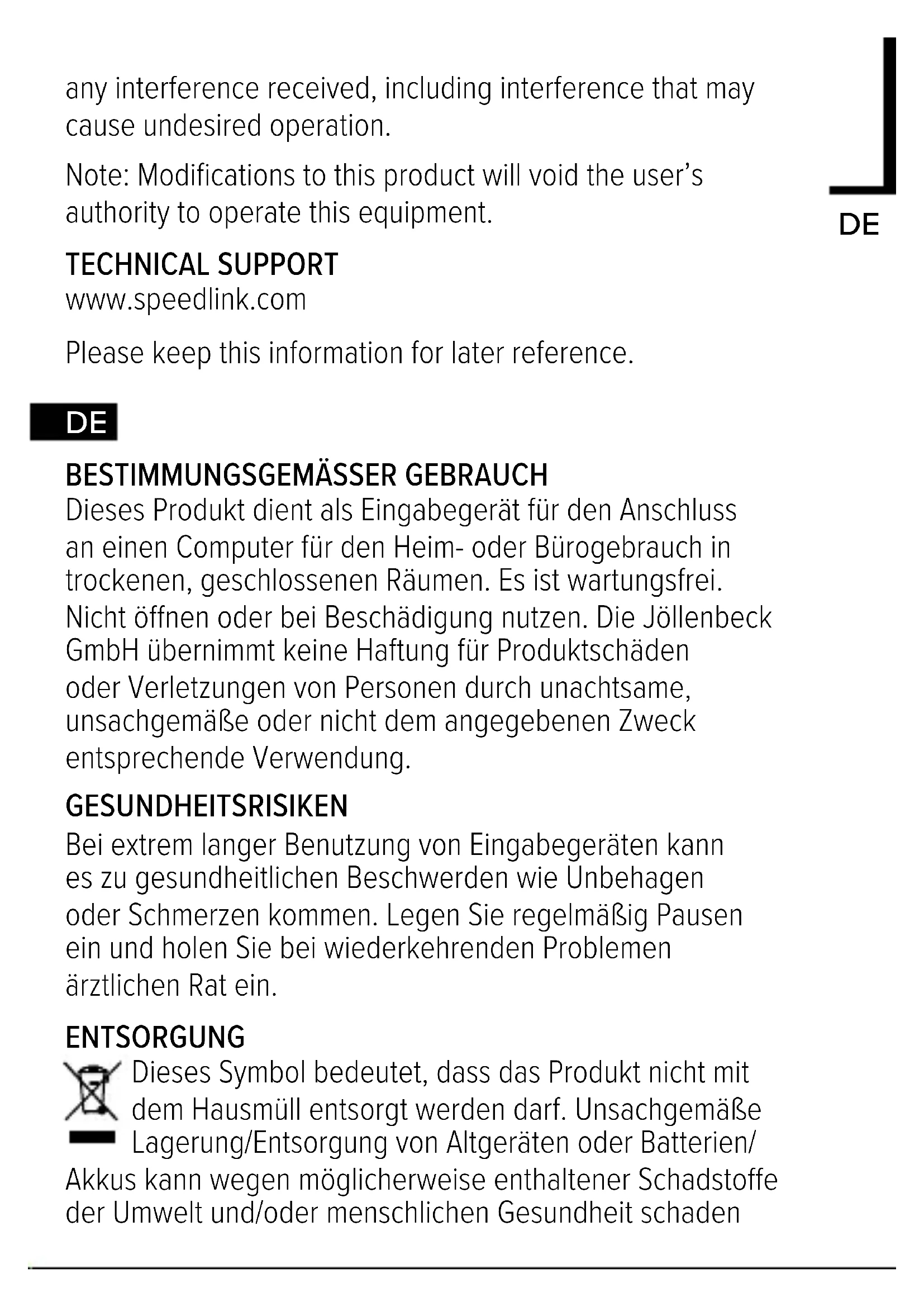 Dieses Produkt dient als Eingabegerät für den Anschluss an einen Computer für den Heim- oder Bürogebrauch in trockenen, geschlossenen Räumen. Es ist wartungsfrei. Nicht önen oder bei Beschädigung nutzen. Die Jöllenbeck GmbH übernimmt keine Haftung für Produktschäden oder Verletzungen von Personen durch unachtsame, unsachgemäße oder nicht dem angegebenen Zweck entsprechende Verwendung. GESUNDHEITSRISIKEN Bei extrem langer Benutzung von Eingabegeräten kann es zu gesundheitlichen Beschwerden wie Unbehagen oder Schmerzen kommen. Legen Sie regelmäßig Pausen ein und holen Sie bei wiederkehrenden Problemen ärztlichen Rat ein. ENTSORGUNG Dieses Symbol bedeutet, dass das Produkt nicht mit dem Hausmüll entsorgt werden darf. Unsachgemäße Lagerung/Entsorgung von Altgeräten oder Batterien/ Akkus kann wegen möglicherweise enthaltener Schadstoe der Umwelt und/oder menschlichen Gesundheit schadenund zu Sanktionen gemäß der Gesetzgebung führen. Die Abgabe bei einer oziellen Sammelstelle ist kostenlos und gesetzlich vorgeschrieben, stellt die korrekte Entsorgung oder Verwertung/ Wiederverwendung sicher und leistet einen Beitrag zum Umweltschutz. Auskunft erteilen Behörden, Wertstohöfe oder Fachgeschäfte. Große Händler (Elektrogeräte-Verkaufsfläche ≥ 400 m²) nehmen Kleingeräte (alle Maße < 25 cm) kostenlos an, andere nur bei Kauf gleichwertiger Produkte. Batterien/Akkus möglichst entnehmen. KONFORMITÄTSHINWEIS Unter Einwirkung von starken statischen, elektrischen oder hochfrequenten Feldern (Funkanlagen, Mobiltelefonen, Mikrowellen-Entladungen) kann es zu Funktionsbeeinträchtigungen des Gerätes (der Geräte) kommen. Versuchen Sie in diesem Fall, die Distanz zu den störenden Geräten zu vergrößern. TECHNISCHER SUPPORT www.speedlink.com Bitte bewahren Sie diese Information zur künftigen Verwendung auf.