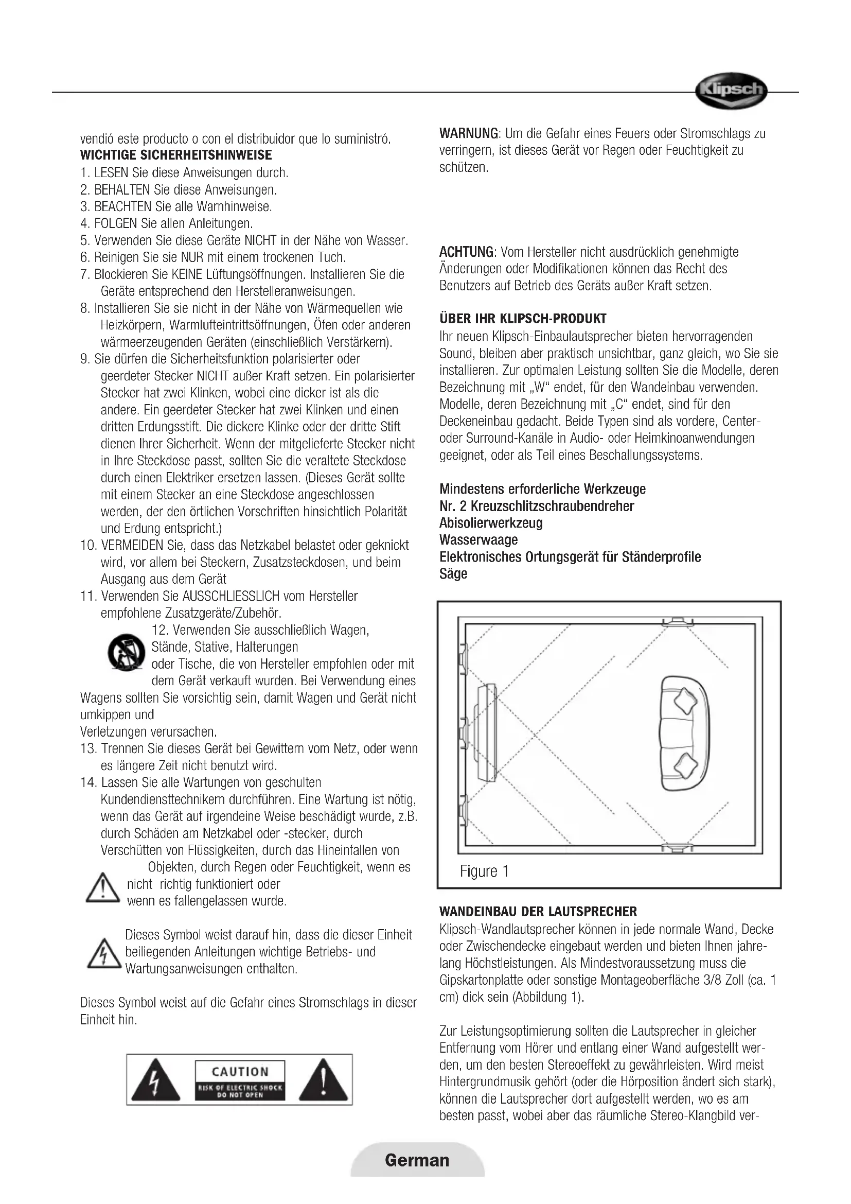 Klipsch-Wandlautsprecher können in jede normale Wand, Decke oder Zwischendecke eingebaut werden und bieten Ihnen jahre- lang Höchstleistungen. Als Mindestvoraussetzung muss die Gipskartonplatte oder sonstige Montageoberfläche 3/8 Zoll (ca. 1 cm) dick sein (Abbildung 1). Zur Leistungsoptimierung sollten die Lautsprecher in gleicher Entfernung vom Hörer und entlang einer Wand aufgestellt wer- den, um den besten Stereoeffekt zu gewährleisten. Wird meist Hintergrundmusik gehört (oder die Hörposition ändert sich stark), können die Lautsprecher dort aufgestellt werden, wo es am besten passt, wobei aber das räumliche Stereo-Klangbild ver- German Figure 1loren gehen kann.