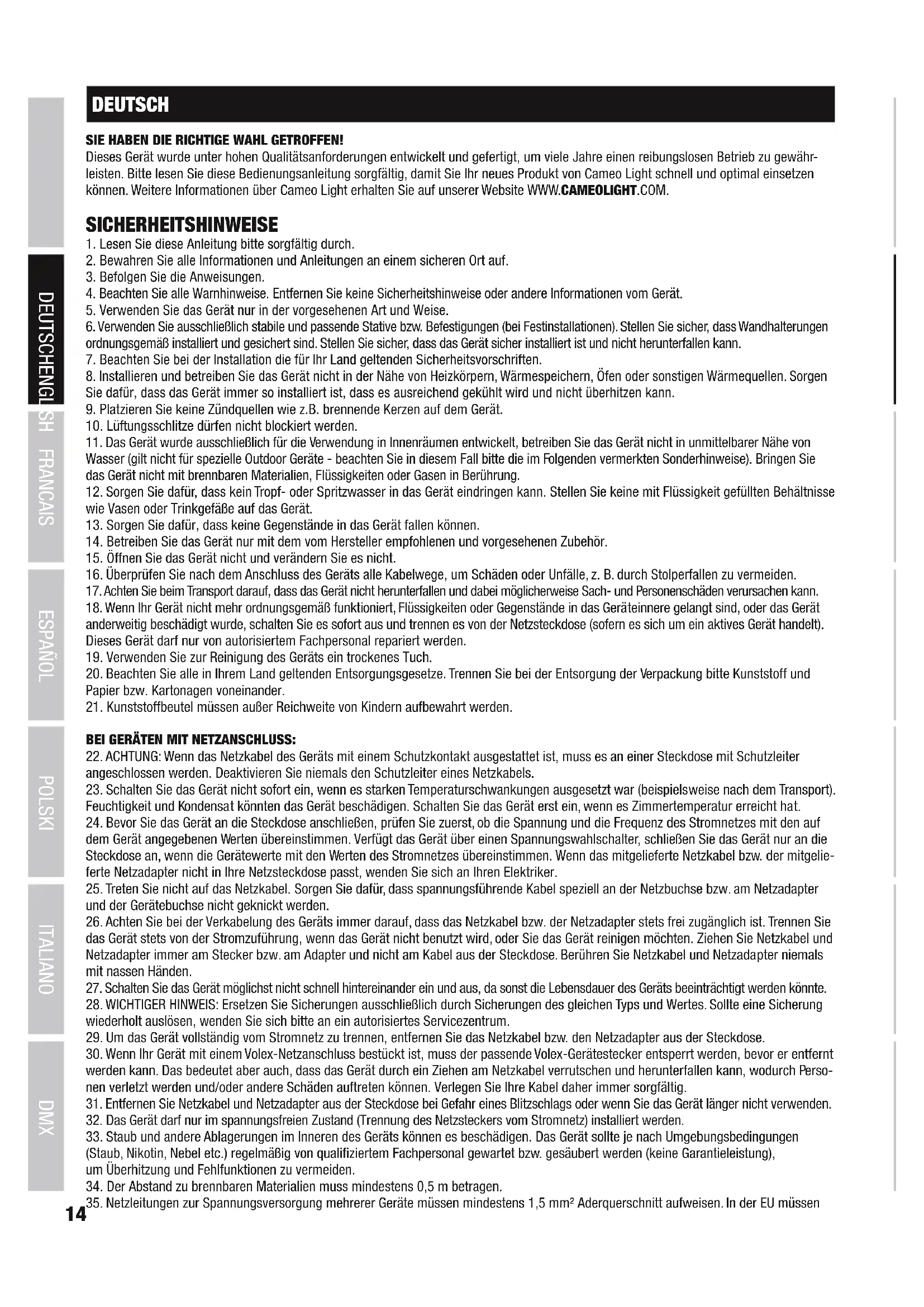 (Gültig in der Europäischen Union und anderen europäischen Ländern mit Mülltrennung) Dieses Symbol auf dem Produkt oder dazugehörigen Dokumenten weist darauf hin, dass das Gerät am Ende der Produktlebenszeit nicht zusammen mit dem normalen Hausmüll entsorgt werden darf, um Umwelt- oder Personenschäden durch unkontrollierte Abfallentsorgung zu vermeiden. Bitte entsorgen Sie dieses Produkt getrennt von anderen Abfällen und führen es zur Förderung nachhaltiger Wirtschaftskreisläufe dem Recycling zu. Als Privatkunde erhalten Sie Informationen zu umweltfreundlichen Entsorgungsmöglichkeiten über den Händler, bei dem das Produkt erworben wurde, oder über die entsprechenden regionalen Behörden. Als gewerblicher Nutzer kontaktieren Sie bitte Ihren Lieferanten und prüfen die ggf. vertraglich vereinbarten Konditionen zur Entsorgung der Geräte. Dieses Produkt darf nicht zusammen mit anderen gewerblichen Abfällen entsorgt werden. CE-Konformität Hiermit erklärt die Adam Hall GmbH, dass dieses Produkt folgenden Richtlinien entspricht (soweit zutreffend): R&TTE (1999/5/EG) bzw. RED (2014/53/EU) ab Juni 2017 Niederspannungsrichtlinie (2014/35/EU) EMV-Richtlinie (2014/30/EU) RoHS (2011/65/EU) Die vollständige Konformitätserklärung finden Sie unter www.adamhall.com. Des Weiteren können Sie diese auch unter info@adamhall.com anfragen. Betriebsspannung: AC 100V - 240V / 50 - 60Hz Leistungsaufnahme: 60W Sicherung: T1A / 250V (5 x 20mm) Umgebungstemperatur (in Betrieb): 10°C - 40°C Relative Luftfeuchtigkeit: <85%, nicht kondensierend Gehäusematerial: ABS/ Metall Gehäusefarbe: schwarz Gehäusekühlung: Lüfter Abmessungen (B x H x T, ohne Bügel): 175 x 175 x 95mm Gewicht: 1,2kg Weitere Eigenschaften: verstellbarer Montagebügel und IR-Fernbedienung inklusive25 DMX DEUTSCHFRANCAIS ESPAÑOL ENGLISH ITALIANO POLSKI FRANCAIS Vous avez fait le bon choix! Cet appareil a été développé et fabriqué en appliquant des exigences de qualité très élevées: il garantit des années de fonctionnement sans problème.Veuillez lire attentivement ce Manuel Utilisateur : vous apprendrez rapidement à utiliser votre appareil Cameo Light de façon optimale. Vous trouverez davantage d‘informations à propos de Cameo Light sur notre site Web: WWW.CAMEOLIGHT.COM.
