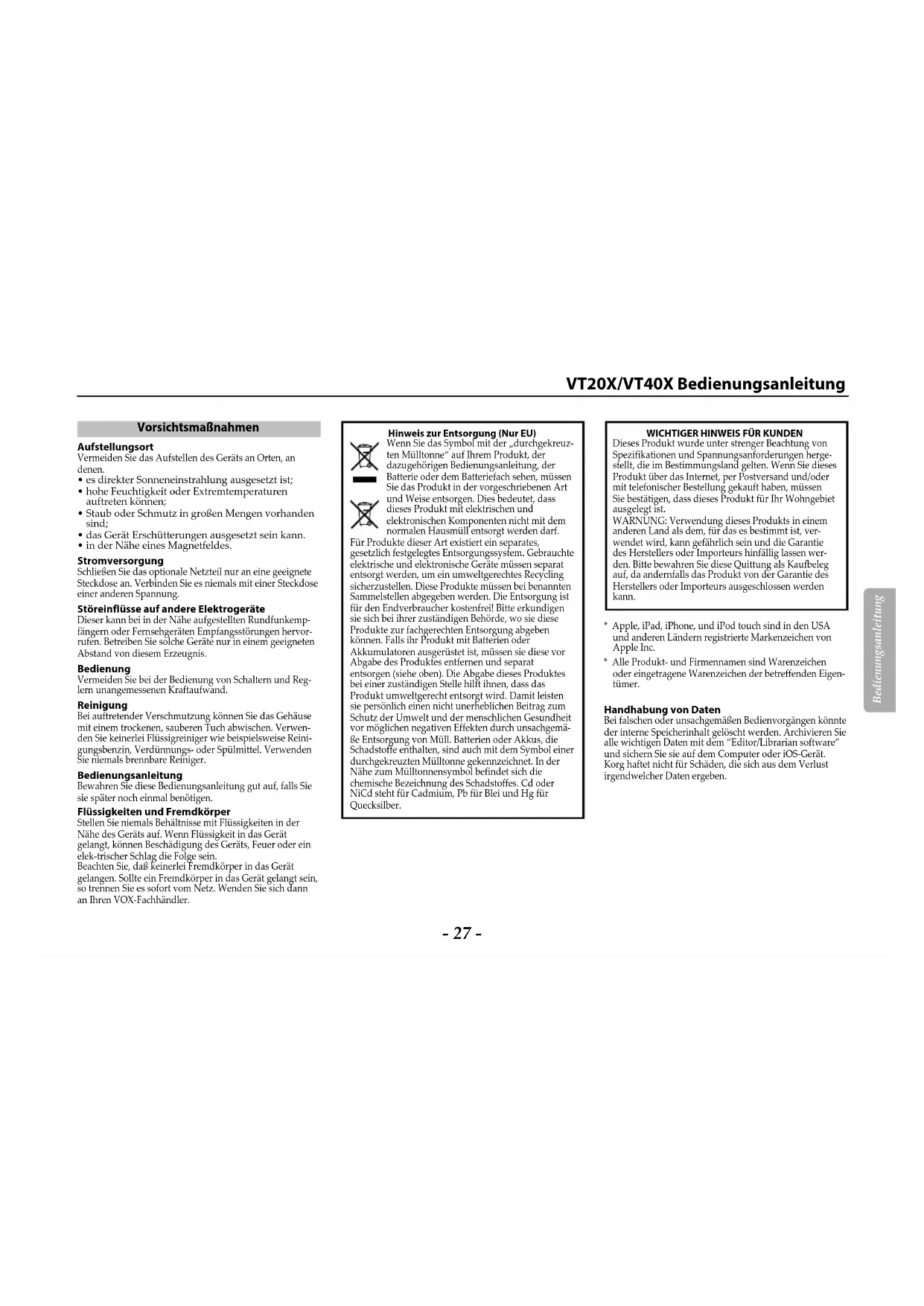 - in der Nähe eines Magnetfeldes. Stromversorgung Schließen Sie das optionale Netzteil nur an eine geeignete Steckdose an. Verbinden Sie es niemals mit einer Steckdose einer anderen Spannung. Störeinflüsse auf andere Elektrogeräte Dieser kann bei in der Nähe aufgestellten Rundfunkemp- fängern oder Fernsehgeräten Empfangsstörungen hervor- rufen. Betreiben Sie solche Geräte nur in einem geeigneten Abstand von diesem Erzeugnis. Bedienung Vermeiden Sie bei der Bedienung von Schaltern und Reg- lern unangemessenen Kraftaufwand. Reinigung Bei auftretender Verschmutzung können Sie das Gehäuse mit einem trockenen, sauberen Tuch abwischen. Verwen- den Sie keinerlei Flüssigreiniger wie beispielsweise Reini- gungsbenzin, Verdünnungs- oder Spülmittel. Verwenden Sie niemals brennbare Reiniger. Bedienungsanleitung Bewahren Sie diese Bedienungsanleitung gut auf, falls Sie sie später noch einmal benötigen. Flüssigkeiten und Fremdkörper Stellen Sie niemals Behältnisse mit Flüssigkeiten in der Nähe des Geräts auf. Wenn Flüssigkeit in das Gerät gelangt, können Beschädigung des Geräts, Feuer oder ein elek-trischer Schlag die Folge sein. Beachten Sie, daß keinerlei Fremdkörper in das Gerät gelangen. Sollte ein Fremdkörper in das Gerät gelangt sein, so trennen Sie es sofort vom Netz. Wenden Sie sich dann an Ihren VOX-Fachhändler. Hinweis zur Entsorgung (Nur EU) Wenn Sie das Symbol mit der „durchgekreuz- ten Mülltonne“ auf Ihrem Produkt, der dazugehörigen Bedienungsanleitung, der Batterie oder dem Batteriefach sehen, müssen Sie das Produkt in der vorgeschriebenen Art und Weise entsorgen. Dies bedeutet, dass dieses Produkt mit elektrischen und elektronischen Komponenten nicht mit dem normalen Hausmüll entsorgt werden darf. Für Produkte dieser Art existiert ein separates, gesetzlich festgelegtes Entsorgungssystem. Gebrauchte elektrische und elektronische Geräte müssen separat entsorgt werden, um ein umweltgerechtes Recycling sicherzustellen. Diese Produkte müssen bei benannten Sammelstellen abgegeben werden. Die Entsorgung ist für den Endverbraucher kostenfrei! Bitte erkundigen sie sich bei ihrer zuständigen Behörde, wo sie diese Produkte zur fachgerechten Entsorgung abgeben können. Falls ihr Produkt mit Batterien oder Akkumulatoren ausgerüstet ist, müssen sie diese vor Abgabe des Produktes entfernen und separat entsorgen (siehe oben). Die Abgabe dieses Produktes bei einer zuständigen Stelle hilft ihnen, dass das Produkt umweltgerecht entsorgt wird. Damit leisten sie persönlich einen nicht unerheblichen Beitrag zum Schutz der Umwelt und der menschlichen Gesundheit vor möglichen negativen Effekten durch unsachgemä- ße Entsorgung von Müll. Batterien oder Akkus, die Schadstoffe enthalten, sind auch mit dem Symbol einer durchgekreuzten Mülltonne gekennzeichnet. In der Nähe zum Mülltonnensymbol befindet sich die chemische Bezeichnung des Schadstoffes. Cd oder NiCd steht für Cadmium, Pb für Blei und Hg für Quecksilber.