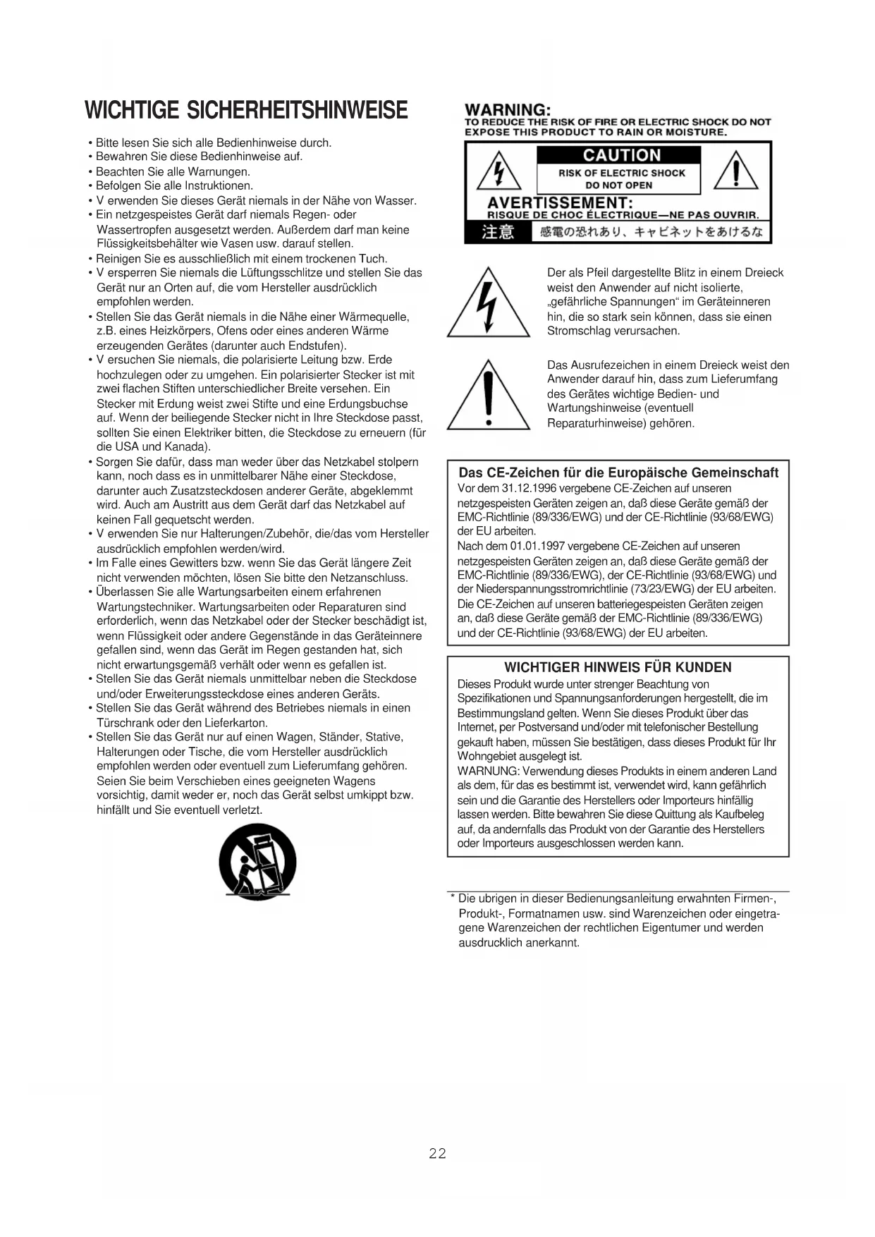 - Stellen Sie das Gerät nur auf einen Wagen, Ständer, Stative, Halterungen oder Tische, die vom Hersteller ausdrücklich empfohlen werden oder eventuell zum Lieferumfang gehören. Seien Sie beim Verschieben eines geeigneten Wagens vorsichtig, damit weder er, noch das Gerät selbst umkippt bzw. hinfällt und Sie eventuell verletzt. Der als Pfeil dargestellte Blitz in einem Dreieck weist den Anwender auf nicht isolierte, „gefährliche Spannungen“ im Geräteinneren hin, die so stark sein können, dass sie einen Stromschlag verursachen. Das Ausrufezeichen in einem Dreieck weist den Anwender darauf hin, dass zum Lieferumfang des Gerätes wichtige Bedien- und Wartungshinweise (eventuell Reparaturhinweise) gehören. Das CE-Zeichen für die Europäische Gemeinschaft Vor dem 31.12.1996 vergebene CE-Zeichen auf unseren netzgespeisten Geräten zeigen an, daß diese Geräte gemäß der EMC-Richtlinie (89/336/EWG) und der CE-Richtlinie (93/68/EWG) der EU arbeiten. Nach dem 01.01.1997 vergebene CE-Zeichen auf unseren netzgespeisten Geräten zeigen an, daß diese Geräte gemäß der EMC-Richtlinie (89/336/EWG), der CE-Richtlinie (93/68/EWG) und der Niederspannungsstromrichtlinie (73/23/EWG) der EU arbeiten. Die CE-Zeichen auf unseren batteriegespeisten Geräten zeigen an, daß diese Geräte gemäß der EMC-Richtlinie (89/336/EWG) und der CE-Richtlinie (93/68/EWG) der EU arbeiten.