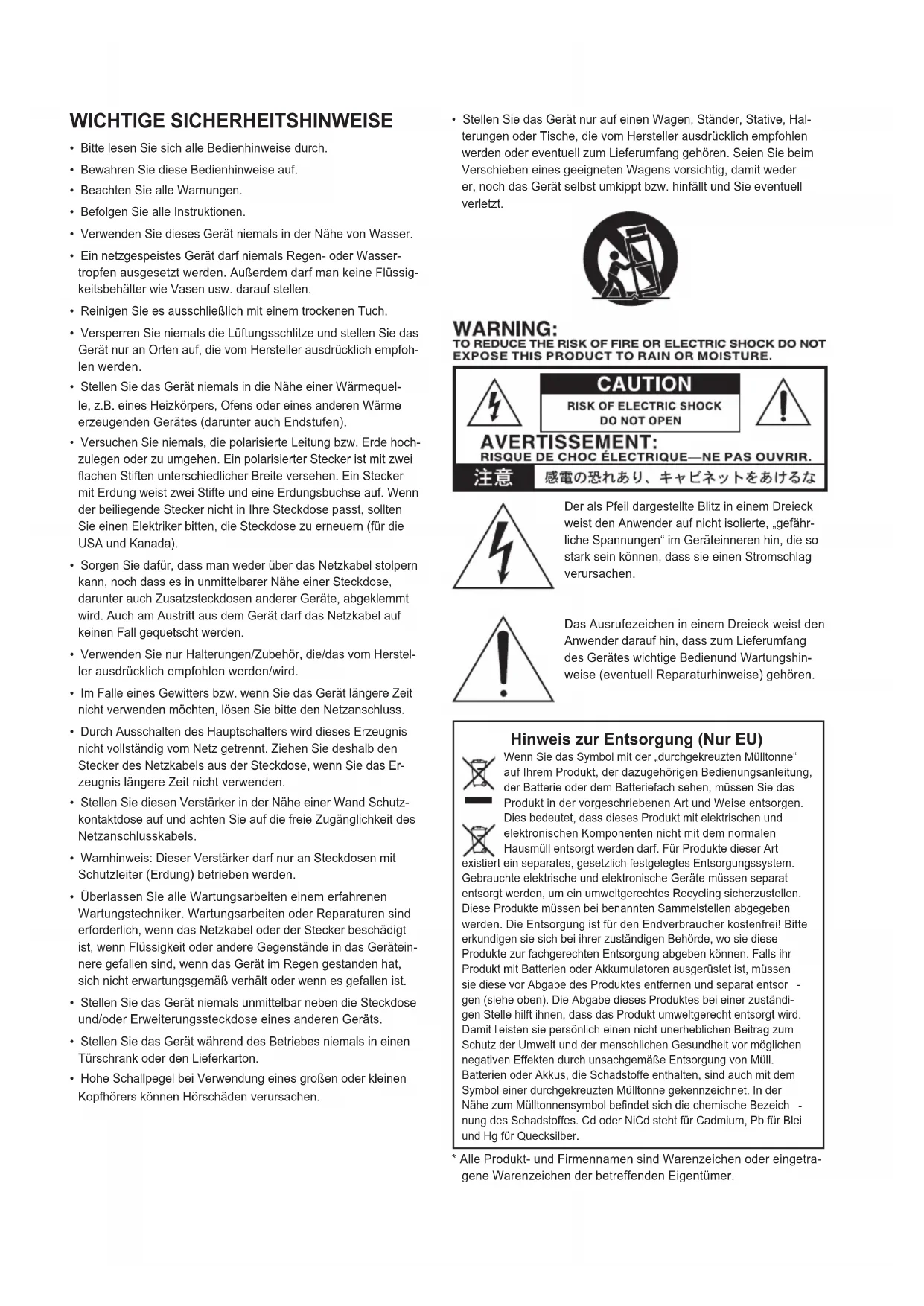 - Warnhinweis: Dieser Verstärker darf nur an Steckdosen mit Schutzleiter (Erdung) betrieben werden.