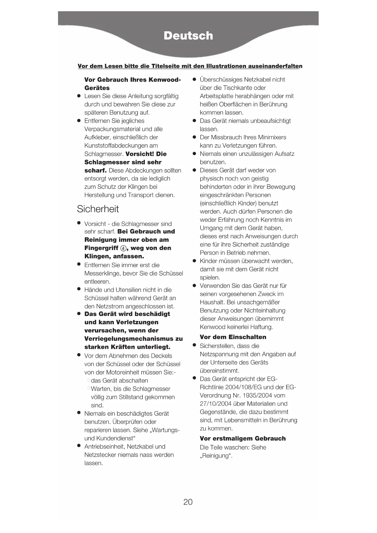 Verwenden Sie das Gerät nur für seinen vorgesehenen Zweck im Haushalt. Bei unsachgemäßer Benutzung oder Nichteinhaltung dieser Anweisungen übernimmt Kenwood keinerlei Haftung. Vor dem Einschalten