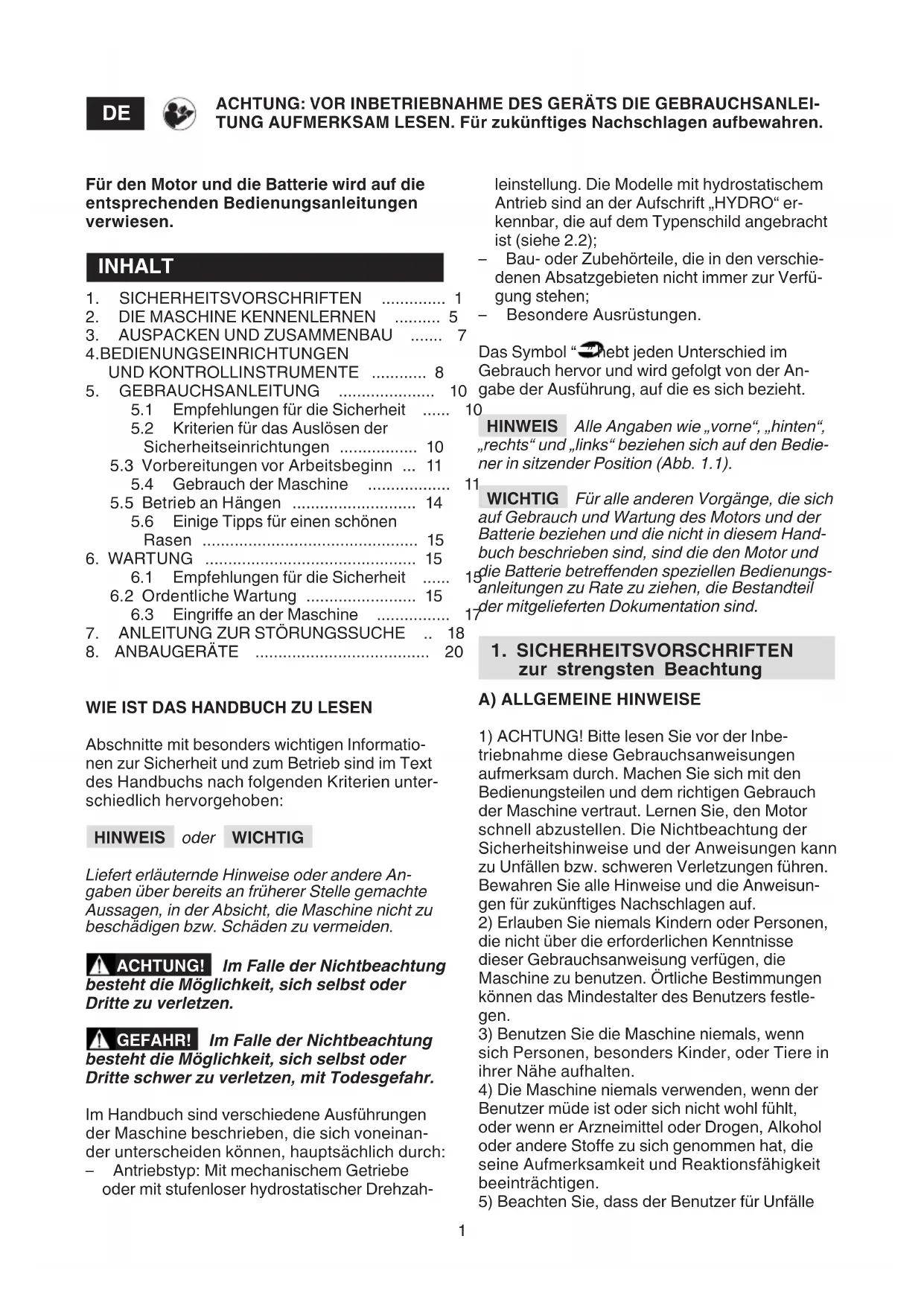 ACHTUNG: VOR INBETRIEBNAHME DES GERÄTS DIE GEBRAUCHSANLEI- TUNG AUFMERKSAM LESEN. Für zukünftiges Nachschlagen aufbewahren. Für den Motor und die Batterie wird auf die entsprechenden Bedienungsanleitungen verwiesen. INHALT 1. SICHERHEITSVORSCHRIFTEN .............. 1