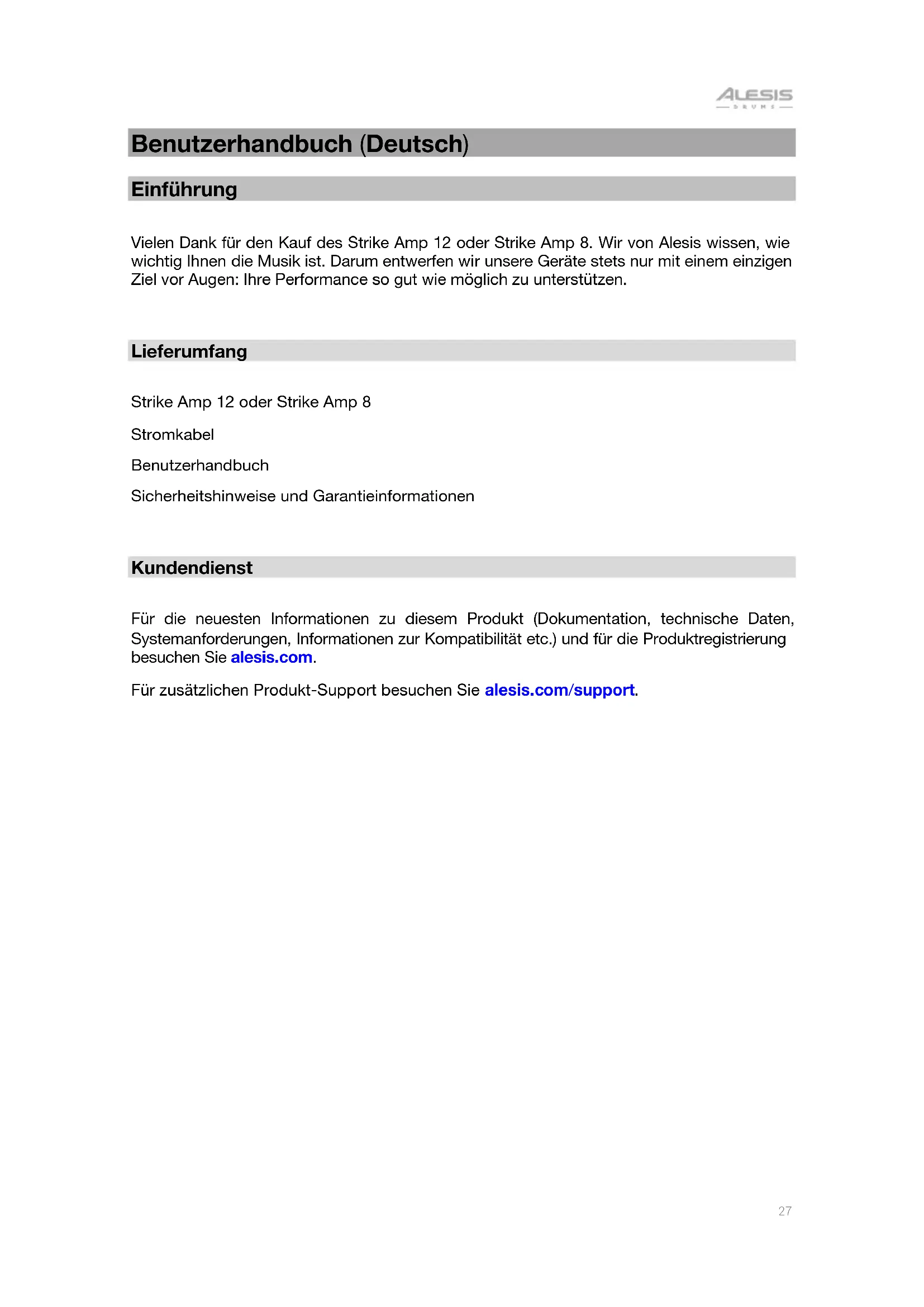 Benutzerhandbuch (Deutsch) Einführung Vielen Dank für den Kauf des Strike Amp 12 oder Strike Amp 8. Wir von Alesis wissen, wie wichtig Ihnen die Musik ist. Darum entwerfen wir unsere Geräte stets nur mit einem einzigen Ziel vor Augen: Ihre Performance so gut wie möglich zu unterstützen.