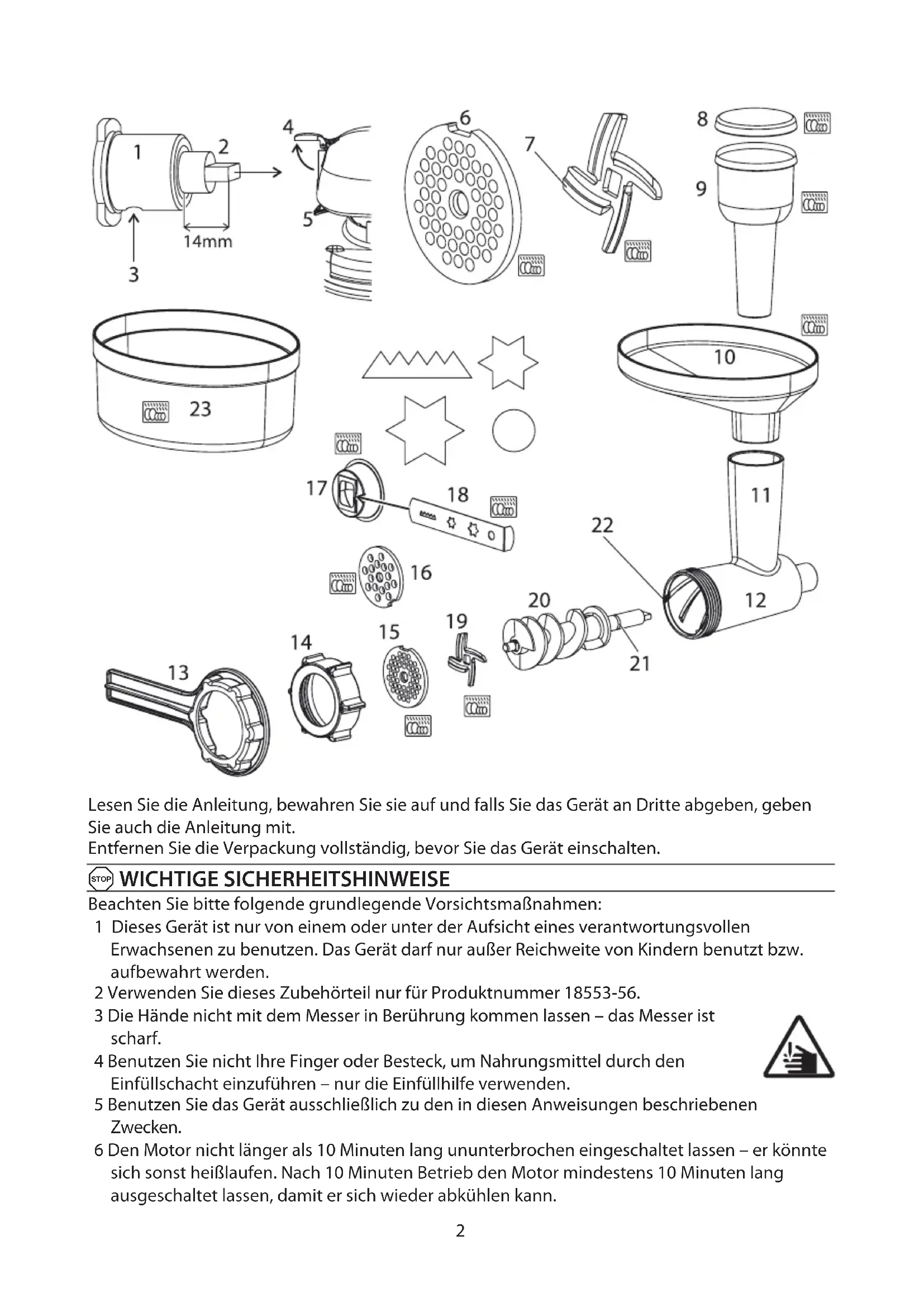 Beachten Sie bitte folgende grundlegende Vorsichtsmaßnahmen: 1 Dieses Gerät ist nur von einem oder unter der Aufsicht eines verantwortungsvollen Erwachsenen zu benutzen. Das Gerät darf nur außer Reichweite von Kindern benutzt bzw. aufbewahrt werden. 2 Verwenden Sie dieses Zubehörteil nur für Produktnummer 18553-56. 3 Die Hände nicht mit dem Messer in Berührung kommen lassen – das Messer ist scharf. 4 Benutzen Sie nicht Ihre Finger oder Besteck, um Nahrungsmittel durch den Einfüllschacht einzuführen – nur die Einfüllhilfe verwenden. 5 Benutzen Sie das Gerät ausschließlich zu den in diesen Anweisungen beschriebenen Zwecken. 6 Den Motor nicht länger als 10 Minuten lang ununterbrochen eingeschaltet lassen – er könnte sich sonst heißlaufen. Nach 10 Minuten Betrieb den Motor mindestens 10 Minuten lang ausgeschaltet lassen, damit er sich wieder abkühlen kann.3 7 Ziehen Sie den Netzstecker, bevor Sie ein Zubehörteil anbringen oder abnehmen möchten. 8 Gerät keinesfalls benutzen, wenn es beschädigt ist oder Fehlfunktion zeigt. nur für den Gebrauch im Haushalt geeignet C MONTAGE 1 Stecken Sie den Schaft in das Gehäuse. 2 Das Ende des Schafts sollte etwa 14mm aus dem hinteren Gehäuse herausragen. 3 Stecken Sie das Messer vorne auf den Schaft. 4 Die flache Seite des Messers sollte in Richtung der Lochscheibe zeigen. 5 Wählen Sie den gewünschten Aufsatz. 6 Die Auskerbung am Rand der Lochscheibe passt über die Klemme vorn am Gehäuse. 7 Setzen Sie den Schraubring auf das Gehäuse und befestigen Sie es manuell. 8 Üben Sie nicht zu viel Druck aus, dadurch kann das Gewinde beschädigt werden. 9 Schalten Sie das Gerät aus () und ziehen Sie den Netzstecker. 10 Öffnen Sie die Abdeckung des vorderen Antriebs. 11 Ziehen Sie die Lasche nach unten und halten Sie sie in dieser Position. 12 Stecken Sie den hinteren Teil des Gehäuses in den vorderen Antrieb des Geräts. 13 Es kann sein, dass Sie es drehen müssen, damit der hintere Teil des Schafts auf den Antrieb passt. 14 Befindet sich der Antrieb in der korrekten Position, drehen Sie das Gehäuse solange, bis sich der Einfüllschacht in senkrechter Position befindet. 15 Lassen Sie die Lasche los - sie sollte sich dann in der Öffnung unter dem hinteren Gehäuse befinden. 16 Setzen Sie den Einfülltrichter in den Einfüllschacht ein. 17 Setzen Sie die Kappe auf die Einfüllhilfe und schieben Sie sie in den Einfüllschacht. 18 Zum Auffangen des Gehackten stellen Sie den Behälter unter den Zerkleinerer. 19 Der Behälter kann umgedreht und als Abdeckung für den Einfülltrichter verwendet werden. C ZERKLEINERN 20 Schneiden Sie das Fleisch in Streifen, etwa 25mm große Quadrate, und legen Sie es in den Trichter. 21 Gerätenetzstecker in die Steckdose stecken. 22 Stellen Sie Geschwindigkeitsstufe 4 oder höher ein. 23 Entfernen Sie die Einfüllhilfe und geben Sie die Zutaten über den Einfüllschacht in den Behälter. 24 Setzen Sie die Einfüllhilfe wieder ein und verwenden Sie diese dafür, die Zutaten vorsichtig über den Einfüllschacht in den Behälter einzuführen. 25 Sobald Sie fertig sind, zerkleinern Sie ein paar Brotreste, damit die Lochscheibe gereinigt wird. 26 Schalten Sie das Gerät aus () und ziehen Sie den Netzstecker. Bedienungsanleitung Zeichnungen 1 Gehäuse (hinten) 2 Schaft (hinten) 3 Öffnung 4 Abdeckung vorderer Antrieb 5 Lasche 6 Auskerbung ` 7 flach ` 8 Kappe ` 9 Einfüllhilfe ` 10 Einfülltrichter ` 11 Einfüllschacht 12 Gehäuse 13 Spannschlüssel 14 Schraubring 15 Scheibe fein ` 16 Scheibe grob ` 17 Spritzgebäckvorsatz ` 18 Spritzgebäckscheibe ` 19 Messer ` 20 Schaft 21 Dichtungsring 22 Klemme 23 Behälter ` ` Spülmaschinenfest4 C WELCHE LOCHSCHEIBE? 27 Verwenden Sie die feine Lochscheibe, um rohes Fleisch zu Gehacktem oder Bouletten zu verarbeiten oder Zitronenschalen zu zerkleinern. 28 Brauchen Sie sehr fein gehacktes Fleisch, etwa für Würste oder Pastete, geben Sie das Ganze ein zweites Mal in den Zerkleinerer. 29 Verwenden Sie die grobe Lochscheibe, um rohes Fleisch für Burger zu verarbeiten. 30 Möchten Sie andere Lebensmittel zerkleinern, verwenden Sie die Lochscheibe, mit der Sie die gewünschte n Zerkleinerungsgrad erreichen.
