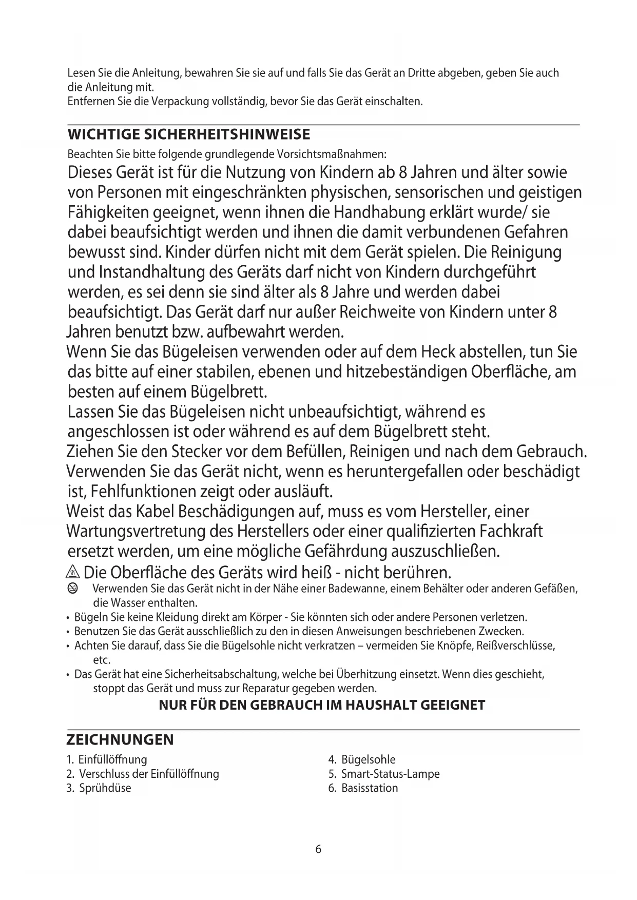 AE6 Lesen Sie die Anleitung, bewahren Sie sie auf und falls Sie das Gerät an Dritte abgeben, geben Sie auch die Anleitung mit. Entfernen Sie die Verpackung vollständig, bevor Sie das Gerät einschalten. WICHTIGE SICHERHEITSHINWEISE Beachten Sie bitte folgende grundlegende Vorsichtsmaßnahmen: Dieses Gerät ist für die Nutzung von Kindern ab 8 Jahren und älter sowie von Personen mit eingeschränkten physischen, sensorischen und geistigen Fähigkeiten geeignet, wenn ihnen die Handhabung erklärt wurde/ sie dabei beaufsichtigt werden und ihnen die damit verbundenen Gefahren bewusst sind. Kinder dürfen nicht mit dem Gerät spielen. Die Reinigung und Instandhaltung des Geräts darf nicht von Kindern durchgeführt werden, es sei denn sie sind älter als 8 Jahre und werden dabei beaufsichtigt. Das Gerät darf nur außer Reichweite von Kindern unter 8 Jahren benutzt bzw. aufbewahrt werden. Wenn Sie das Bügeleisen verwenden oder auf dem Heck abstellen, tun Sie das bitte auf einer stabilen, ebenen und hitzebeständigen Oberäche, am besten auf einem Bügelbrett. Lassen Sie das Bügeleisen nicht unbeaufsichtigt, während es angeschlossen ist oder während es auf dem Bügelbrett steht. Ziehen Sie den Stecker vor dem Befüllen, Reinigen und nach dem Gebrauch. Verwenden Sie das Gerät nicht, wenn es heruntergefallen oder beschädigt ist, Fehlfunktionen zeigt oder ausläuft. Weist das Kabel Beschädigungen auf, muss es vom Hersteller, einer Wartungsvertretung des Herstellers oder einer qualizierten Fachkraft ersetzt werden, um eine mögliche Gefährdung auszuschließen. h Die Oberäche des Geräts wird heiß - nicht berühren. b Verwenden Sie das Gerät nicht in der Nähe einer Badewanne, einem Behälter oder anderen Gefäßen, die Wasser enthalten.