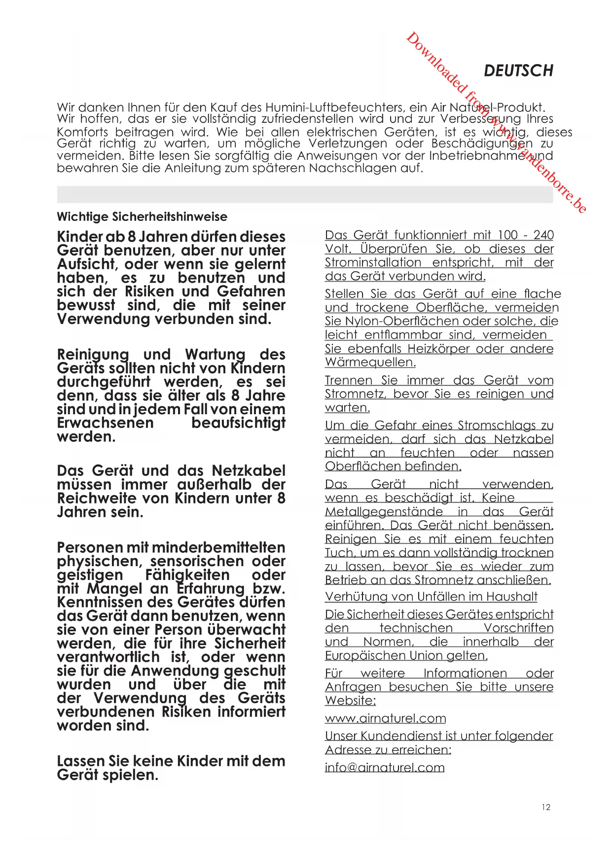 Downloaded from www.vandenborre.beDEUTSCH Kinder ab 8 Jahren dürfen dieses Gerät benutzen, aber nur unter Aufsicht, oder wenn sie gelernt haben, es zu benutzen und sich der Risiken und Gefahren bewusst sind, die mit seiner Verwendung verbunden sind. Reinigung und Wartung des Geräts sollten nicht von Kindern durchgeführt werden, es sei denn, dass sie älter als 8 Jahre sind und in jedem Fall von einem Erwachsenen beaufsichtigt werden. Das Gerät und das Netzkabel müssen immer außerhalb der Reichweite von Kindern unter 8 Jahren sein. Personen mit minderbemittelten physischen, sensorischen oder geistigen Fähigkeiten oder mit Mangel an Erfahrung bzw. Kenntnissen des Gerätes dürfen das Gerät dann benutzen, wenn sie von einer Person überwacht werden, die für ihre Sicherheit verantwortlich ist, oder wenn sie für die Anwendung geschult wurden und über die mit der Verwendung des Geräts verbundenen Risiken informiert worden sind. Lassen Sie keine Kinder mit dem Gerät spielen. Das Gerät funktionniert mit 100 - 240 Volt. Überprüfen Sie, ob dieses der Strominstallation entspricht, mit der das Gerät verbunden wird. Stellen Sie das Gerät auf eine ache und trockene Oberäche, vermeiden Sie Nylon-Oberächen oder solche, die leicht entammbar sind, vermeiden Sie ebenfalls Heizkörper oder andere Wärmequellen. Trennen Sie immer das Gerät vom Stromnetz, bevor Sie es reinigen und warten. Um die Gefahr eines Stromschlags zu vermeiden, darf sich das Netzkabel nicht an feuchten oder nassen Oberächen benden. Das Gerät nicht verwenden, wenn es beschädigt ist. Keine Metallgegenstände in das Gerät einführen. Das Gerät nicht benässen. Reinigen Sie es mit einem feuchten Tuch, um es dann vollständig trocknen zu lassen, bevor Sie es wieder zum Betrieb an das Stromnetz anschließen. Verhütung von Unfällen im Haushalt Die Sicherheit dieses Gerätes entspricht den technischen Vorschriften und Normen, die innerhalb der Europäischen Union gelten. Für weitere Informationen oder Anfragen besuchen Sie bitte unsere Website: www.airnaturel.com Unser Kundendienst ist unter folgender Adresse zu erreichen: info@airnaturel.com Wir danken Ihnen für den Kauf des Humini-Luftbefeuchters, ein Air Naturel-Produkt. Wir hoffen, das er sie vollständig zufriedenstellen wird und zur Verbesserung Ihres Komforts beitragen wird. Wie bei allen elektrischen Geräten, ist es wichtig, dieses Gerät richtig zu warten, um mögliche Verletzungen oder Beschädigungen zu vermeiden. Bitte lesen Sie sorgfältig die Anweisungen vor der Inbetriebnahme und bewahren Sie die Anleitung zum späteren Nachschlagen auf. Wichtige Sicherheitshinweise