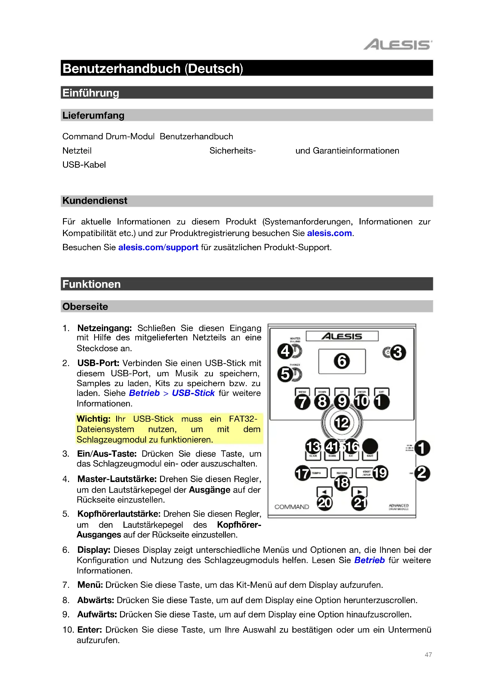 Benutzerhandbuch (Deutsch) Einführung Lieferumfang Command Drum-Modul Benutzerhandbuch Netzteil Sicherheits- und Garantieinformationen USB-Kabel