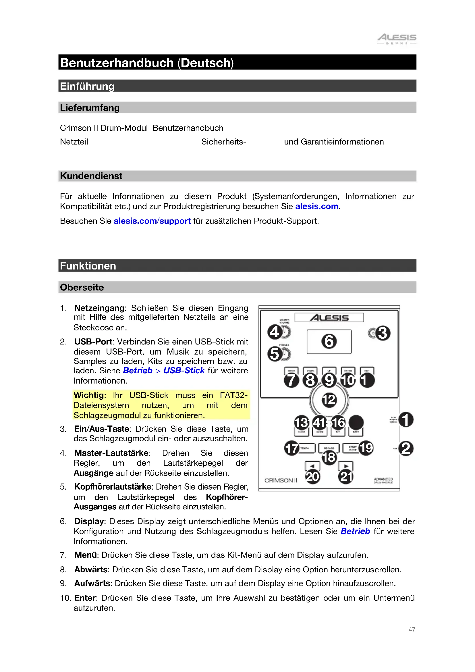 Kundendienst Für aktuelle Informationen zu diesem Produkt (Systemanforderungen, Informationen zur Kompatibilität etc.) und zur Produktregistrierung besuchen Sie alesis.com. Besuchen Sie alesis.com/support für zusätzlichen Produkt-Support.