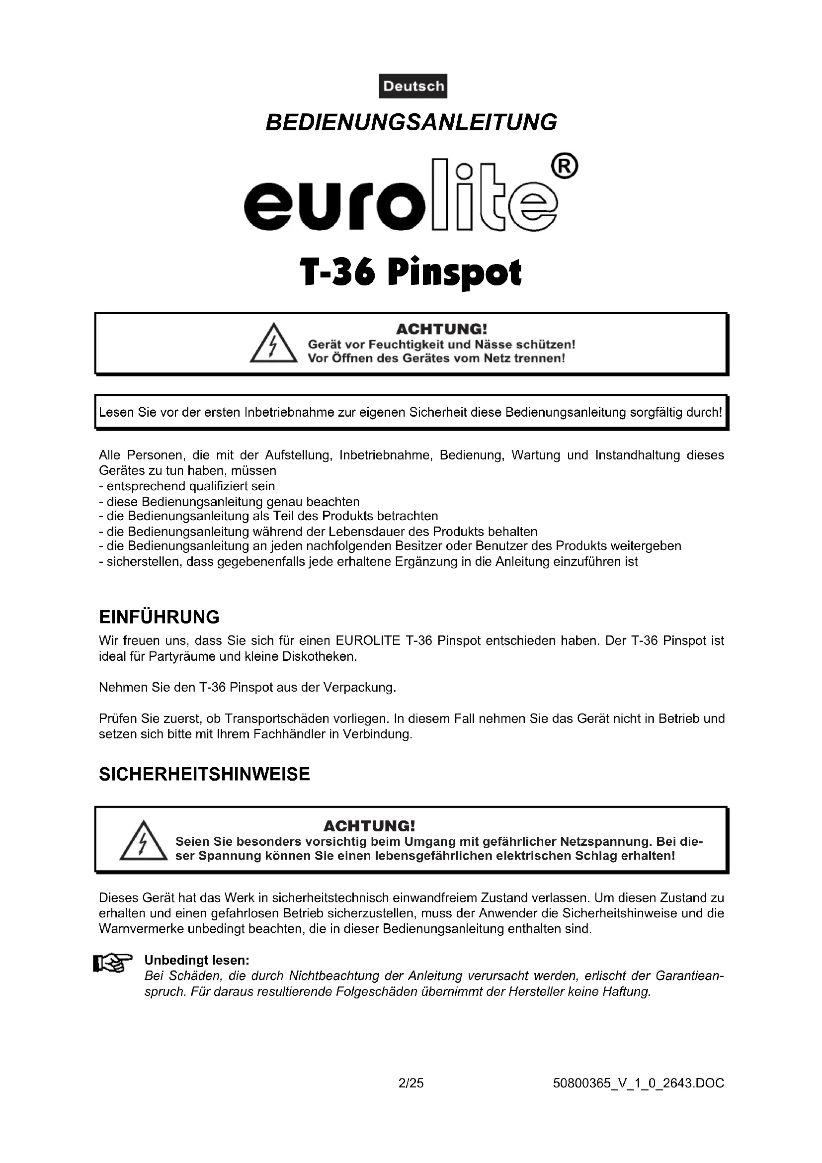 T-36 Pinspot50800365_V_1_0_2643.DOC 2/25 BEDIENUNGSANLEITUNG T-36 Pinspot Lesen Sie vor der ersten Inbetriebnahme zur eigenen Sicherheit diese Bedienungsanleitung sorgfältig durch! Alle Personen, die mit der Aufstellung, Inbetriebnahme, Bedienung, Wartung und Instandhaltung dieses Gerätes zu tun haben, müssen - entsprechend qualifiziert sein - diese Bedienungsanleitung genau beachten - die Bedienungsanleitung als Teil des Produkts betrachten - die Bedienungsanleitung während der Lebensdauer des Produkts behalten - die Bedienungsanleitung an jeden nachfolgenden Besitzer oder Benutzer des Produkts weitergeben - sicherstellen, dass gegebenenfalls jede erhaltene Ergänzung in die Anleitung einzuführen ist EINFÜHRUNG Wir freuen uns, dass Sie sich für einen EUROLITE T-36 Pinspot entschieden haben. Der T-36 Pinspot ist ideal für Partyräume und kleine Diskotheken. Nehmen Sie den T-36 Pinspot aus der Verpackung. Prüfen Sie zuerst, ob Transportschäden vorliegen. In diesem Fall nehmen Sie das Gerät nicht in Betrieb und setzen sich bitte mit Ihrem Fachhändler in Verbindung. SICHERHEITSHINWEISE ACHTUNG! Seien Sie besonders vorsichtig beim Umgang mit gefährlicher Netzspannung. Bei die- ser Spannung können Sie einen lebensgefährlichen elektrischen Schlag erhalten! Dieses Gerät hat das Werk in sicherheitstechnisch einwandfreiem Zustand verlassen. Um diesen Zustand zu erhalten und einen gefahrlosen Betrieb sicherzustellen, muss der Anwender die Sicherheitshinweise und die Warnvermerke unbedingt beachten, die in dieser Bedienungsanleitung enthalten sind. Unbedingt lesen: Bei Schäden, die durch Nichtbeachtung der Anleitung verursacht werden, erlischt der Garantiean- spruch. Für daraus resultierende Folgeschäden übernimmt der Hersteller keine Haftung.50800365_V_1_0_2643.DOC 3/25 Das Gerät darf nicht in Betrieb genommen werden, nachdem es von einem kalten in einen warmen Raum gebracht wurde. Das dabei entstehende Kondenswasser kann unter Umständen Ihr Gerät zerstören. Lassen Sie das Gerät solange uneingeschaltet, bis es Zimmertemperatur erreicht hat! Der Aufbau entspricht der Schutzklasse I. Gemäß den Vorschriften muss daher der Schutzleiter ange- schlossen werden. Der elektrische Anschluss darf nur von einer Fachkraft durchgeführt werden. Lassen Sie die Netzleitung nicht mit anderen Kabeln in Kontakt kommen! Seien Sie vorsichtig beim Umgang mit Netzleitungen und -anschlüssen. Fassen Sie diese Teile nie mit nassen Händen an! Vergewissern Sie sich, dass die anzuschließende Netzspannung nicht höher ist als angegeben. Achten Sie darauf, dass die Netzleitung nicht gequetscht oder durch scharfe Kanten beschädigt werden kann. Überprüfen Sie den Pinspot und die Netzleitung in regelmäßigen Abständen auf Beschädigungen. Pinspot bei Nichtbenutzung und vor jeder Reinigung vom Netz trennen! Bei der ersten Inbetriebnahme kann es zu Rauch- und Geruchserzeugung kommen. Hierbei handelt es sich nicht um eine Störung des Pinspots. Niemals das Gehäuse des Pinspots während des Betriebes mit bloßen Händen berühren (Gehäuse erwärmt sich)! Vermeiden Sie es, den Pinspot in kurzen Intervallen an- und auszuschalten (z. B. Sekundentakt), da ansonsten die Lebensdauer der Lampe erheblich reduziert werden würde. GESUNDHEITSRISIKO! Blicken Sie niemals direkt in die Lichtquelle, da bei empfindlichen Menschen u. U. epileptische Anfälle ausgelöst werden können (gilt besonders für Epileptiker)! Kinder und Laien vom Gerät fern halten!