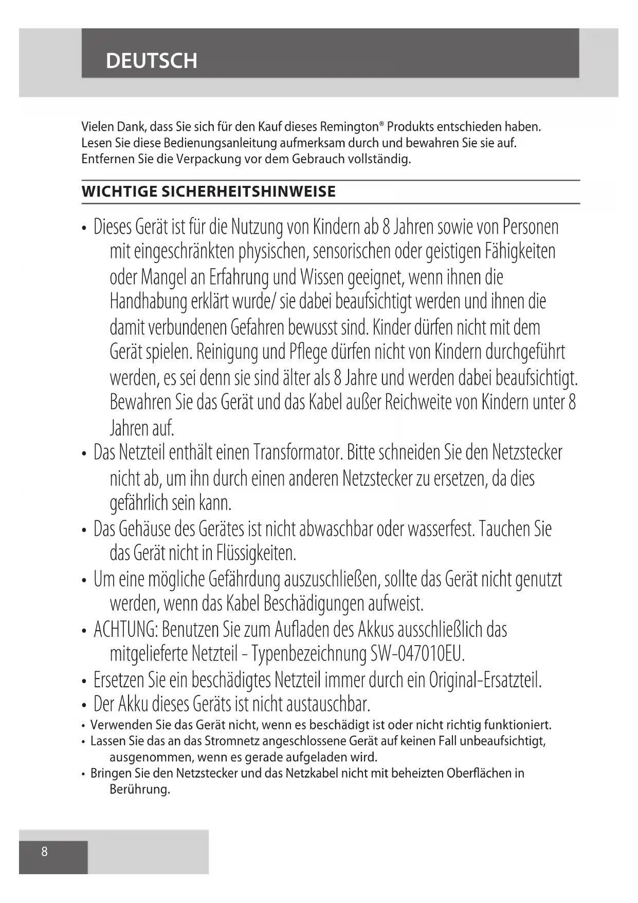 AE8 Vielen Dank, dass Sie sich für den Kauf dieses Remington® Produkts entschieden haben. Lesen Sie diese Bedienungsanleitung aufmerksam durch und bewahren Sie sie auf. Entfernen Sie die Verpackung vor dem Gebrauch vollständig. WICHTIGE SICHERHEITSHINWEISE