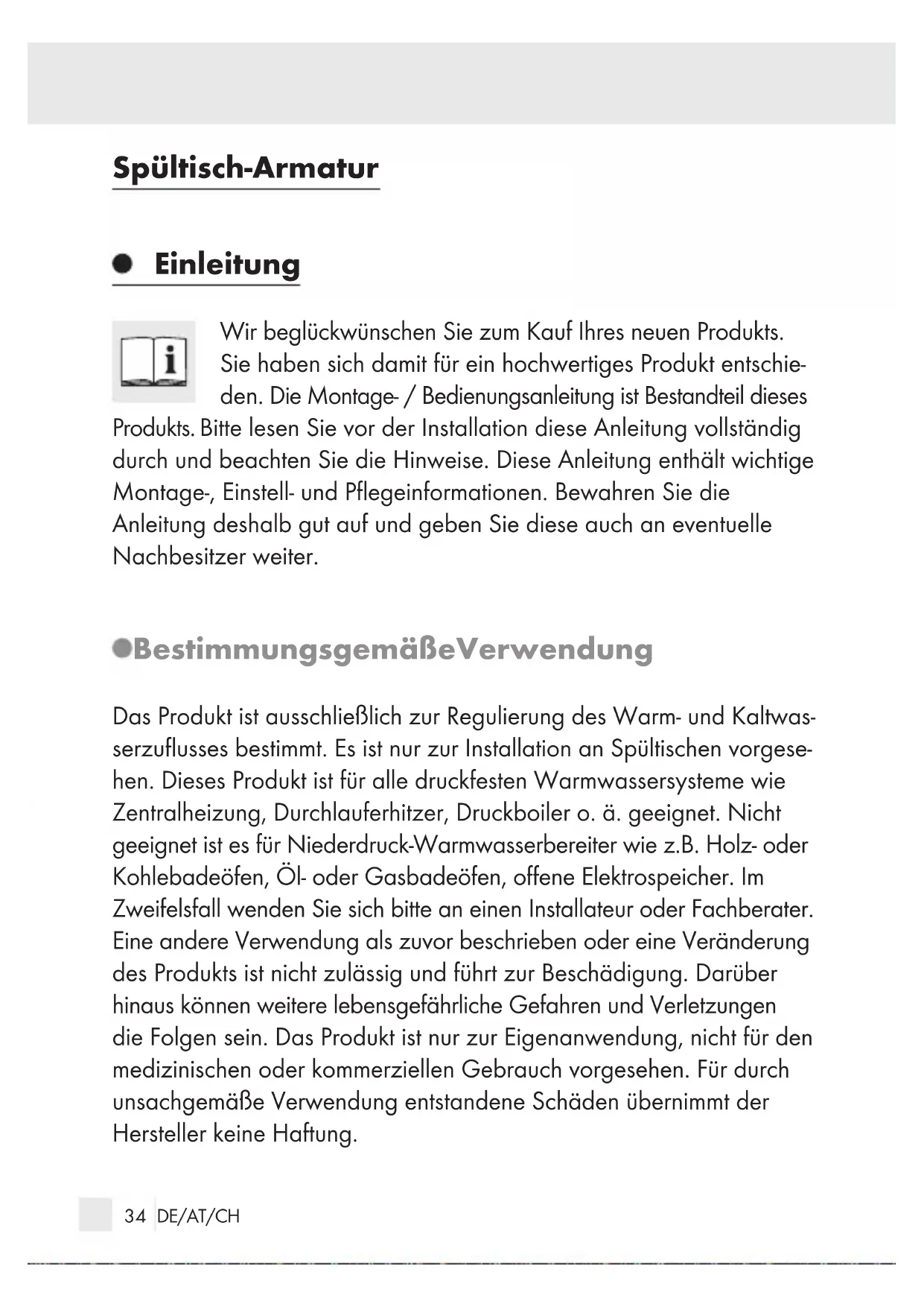- Gratis nummer Productbeschrijving: Spoeltafel-armatuur 90050_Spueltisch-Armatur_Content_LB2 (BE).indd 31 14.03.13 08:2832 90050_Spueltisch-Armatur_Content_LB2 (BE).indd 32 14.03.13 08:2833 DE/AT/CH Einleitung Bestimmungsgemäße Verwendung ........................................ Seite 34 Teilebeschreibung ................................................................... Seite 35 Technische Daten .................................................................... Seite 35 Lieferumfang ............................................................................ Seite 35 Sicherheitshinweise .................................................... Seite 36 Montage ............................................................................... Seite 37 Inbetriebnahme ............................................................. Seite 38 Bedienung .......................................................................... Seite 39 Eco-Funktion / Wasser sparen ................................................ Seite 40 Verbrühschutz einstellen ......................................................... Seite 40 Wartung und Reinigung Armatur pflegen und reinigen ................................................ Seite 42 Kartusche austauschen ........................................................... Seite 43 Entsorgung ......................................................................... Seite 44 Informationen Trinkbarkeit von Leitungswasser ............................................. Seite 44 Garantie und Service ................................................ Seite 45 90050_Spueltisch-Armatur_Content_LB2 (BE).indd 33 14.03.13 08:2834 DE/AT/CH Spültisch-Armatur Einleitung Wir beglückwünschen Sie zum Kauf Ihres neuen Produkts. Sie haben sich damit für ein hochwertiges Produkt entschie- den. Die Montage- / Bedienungsanleitung ist Bestandteil dieses Produkts. Bitte lesen Sie vor der Installation diese Anleitung vollständig durch und beachten Sie die Hinweise. Diese Anleitung enthält wichtige Montage-, Einstell- und Pflegeinformationen. Bewahren Sie die Anleitung deshalb gut auf und geben Sie diese auch an eventuelle Nachbesitzer weiter. Bestimmungsgemäße Verwendung Das Produkt ist ausschließlich zur Regulierung des Warm- und Kaltwas- serzuflusses bestimmt. Es ist nur zur Installation an Spültischen vorgese- hen. Dieses Produkt ist für alle druckfesten Warmwassersysteme wie Zentralheizung, Durchlauferhitzer, Druckboiler o. ä. geeignet. Nicht geeignet ist es für Niederdruck-Warmwasserbereiter wie z.B. Holz- oder Kohlebadeöfen, Öl- oder Gasbadeöfen, offene Elektrospeicher. Im Zweifelsfall wenden Sie sich bitte an einen Installateur oder Fachberater. Eine andere Verwendung als zuvor beschrieben oder eine Veränderung des Produkts ist nicht zulässig und führt zur Beschädigung. Darüber hinaus können weitere lebensgefährliche Gefahren und Verletzungen die Folgen sein. Das Produkt ist nur zur Eigenanwendung, nicht für den medizinischen oder kommerziellen Gebrauch vorgesehen. Für durch unsachgemäße Verwendung entstandene Schäden übernimmt der Hersteller keine Haftung. 90050_Spueltisch-Armatur_Content_LB2 (BE).indd 34 14.03.13 08:2835 DE/AT/CH Teilebeschreibung