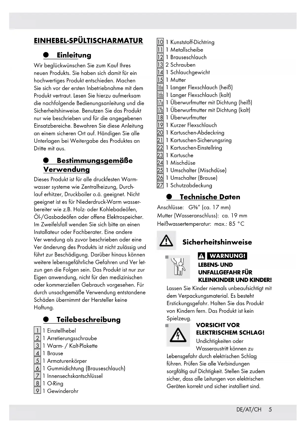 DE/AT/CH EINHEBEL-SPÜLTISCHARMATUR Einleitung Wir beglückwünschen Sie zum Kauf Ihres neuen Produkts. Sie haben sich damit für ein hochwertiges Produkt entschieden. Machen Sie sich vor der ersten Inbetriebnahme mit dem Produkt vertraut. Lesen Sie hierzu aufmerksam die nachfolgende Bedienungsanleitung und die Sicherheitshinweise. Benutzen Sie das Produkt nur wie beschrieben und für die angegebenen Einsatzbereiche. Bewahren Sie diese Anleitung an einem sicheren Ort auf. Händigen Sie alle Unterlagen bei Weitergabe des Produktes an Dritte mit aus. Bestimmungsgemäße Verwendung Dieses Produkt ist für alle druckfesten Warm- wasser systeme wie Zentralheizung, Durch- lauf erhitzer, Druckboiler o.ä. geeignet. Nicht geeignet ist es für Niederdruck-Warm wasser- bereiter wie z.B. Holz- oder Kohlebadeöfen, Öl-/Gasbadeöfen oder offene Elektrospeicher. Im Zweifelsfall wenden Sie sich bitte an einen Installateur oder Fachberater. Eine andere Ver wendung als zuvor beschrieben oder eine Ver änderung des Produkts ist nicht zulässig und führt zur Beschädigung. Darüber hinaus können weitere lebensgefährliche Gefahren und Ver let- zun gen die Folgen sein. Das Produkt ist nur zur Eigen anwendung, nicht für den medizinischen oder kommerziellen Gebrauch vorgesehen. Für durch unsachgemäße Verwendung entstandene Schäden übernimmt der Hersteller keine Haftung. Teilebeschreibung