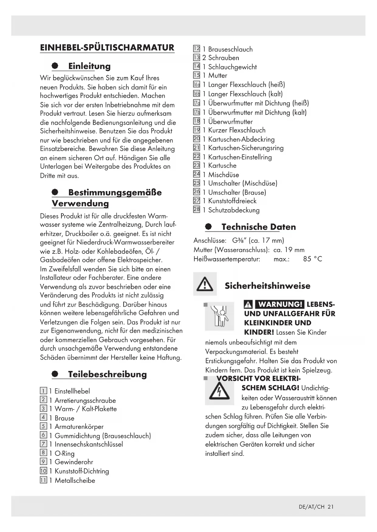 1 Schutzabdeckung § Technische Daten Anschlüsse: G3⁄8” (ca. 17 mm) Mutter (Wasseranschluss): ca. 19 mm Heißwassertemperatur: max.: 85 °C Sicherheitshinweise