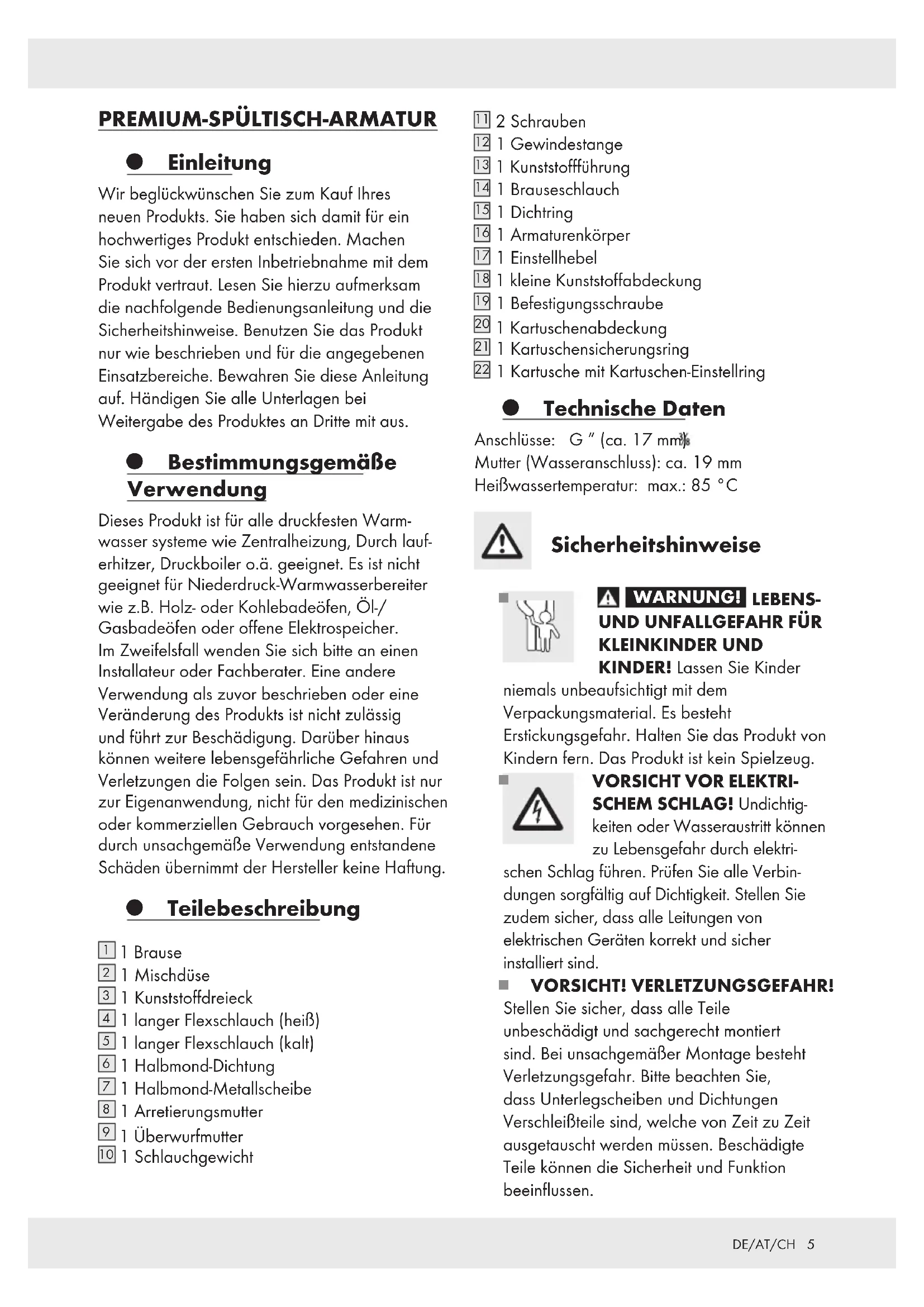 DE/AT/CH PREMIUM-SPÜLTISCH-ARMATUR Einleitung Wir beglückwünschen Sie zum Kauf Ihres neuen Produkts. Sie haben sich damit für ein hochwertiges Produkt entschieden. Machen Sie sich vor der ersten Inbetriebnahme mit dem Produkt vertraut. Lesen Sie hierzu aufmerksam die nachfolgende Bedienungsanleitung und die Sicherheitshinweise. Benutzen Sie das Produkt nur wie beschrieben und für die angegebenen Einsatzbereiche. Bewahren Sie diese Anleitung auf. Händigen Sie alle Unterlagen bei Weitergabe des Produktes an Dritte mit aus. Bestimmungsgemäße Verwendung Dieses Produkt ist für alle druckfesten Warm- wasser systeme wie Zentralheizung, Durch lauf- erhitzer, Druckboiler o.ä. geeignet. Es ist nicht geeignet für Niederdruck-Warmwasserbereiter wie z.B. Holz- oder Kohlebadeöfen, Öl-/ Gasbadeöfen oder offene Elektrospeicher. Im Zweifelsfall wenden Sie sich bitte an einen Installateur oder Fachberater. Eine andere Verwendung als zuvor beschrieben oder eine Veränderung des Produkts ist nicht zulässig und führt zur Beschädigung. Darüber hinaus können weitere lebensgefährliche Gefahren und Verletzungen die Folgen sein. Das Produkt ist nur zur Eigenanwendung, nicht für den medizinischen oder kommerziellen Gebrauch vorgesehen. Für durch unsachgemäße Verwendung entstandene Schäden übernimmt der Hersteller keine Haftung. Teilebeschreibung