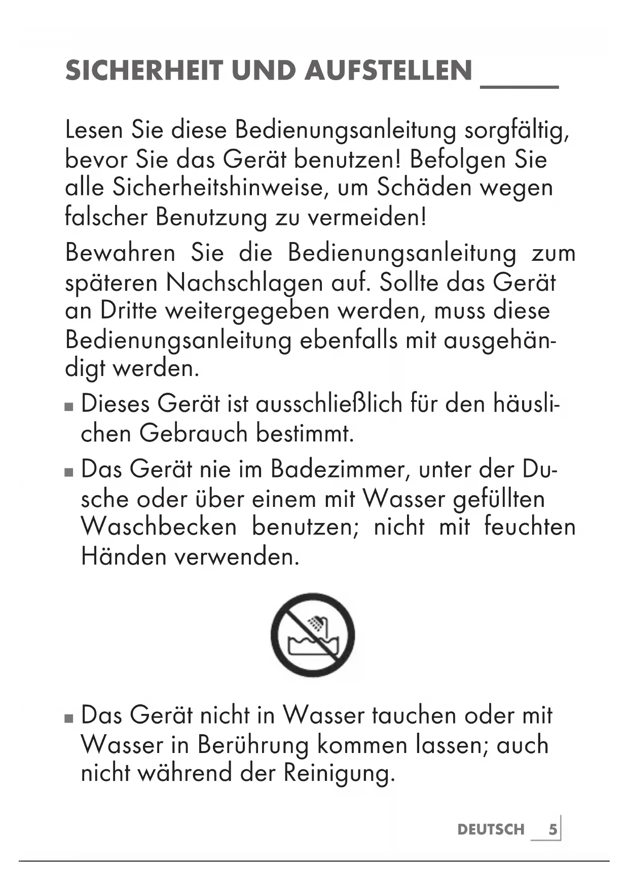 Das Gerät nie im Badezimmer, unter der Du- sche oder über einem mit Wasser gefüllten Waschbecken benutzen; nicht mit feuchten Händen verwenden.