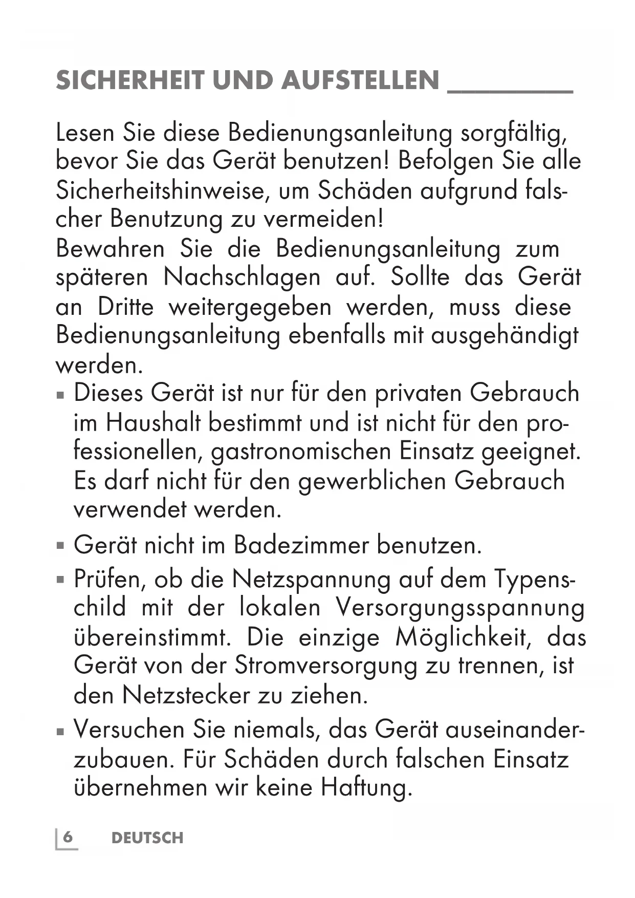 Dieses Gerät ist nur für den privaten Gebrauch im Haushalt bestimmt und ist nicht für den pro- fessionellen, gastronomischen Einsatz geeignet. Es darf nicht für den gewerblichen Gebrauch verwendet werden.