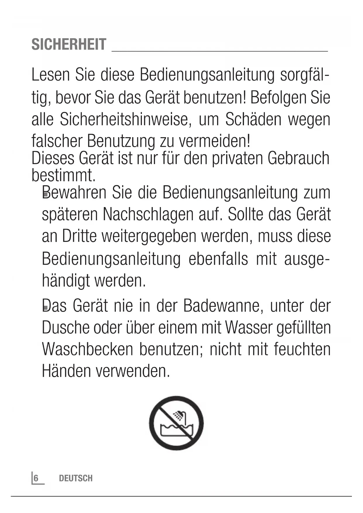 Das Gerät nie in der Badewanne, unter der Dusche oder über einem mit Wasser gefüllten Waschbecken benutzen; nicht mit feuchten Händen verwenden.DEUTSCH