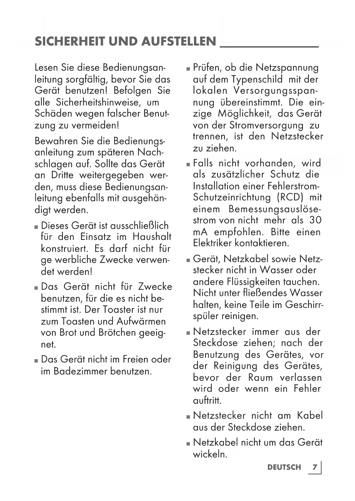 Das Gerät nicht für Zwecke benutzen, für die es nicht be- stimmt ist. Der Toaster ist nur zum Toasten und Aufwärmen von Brot und Brötchen geeig- net.