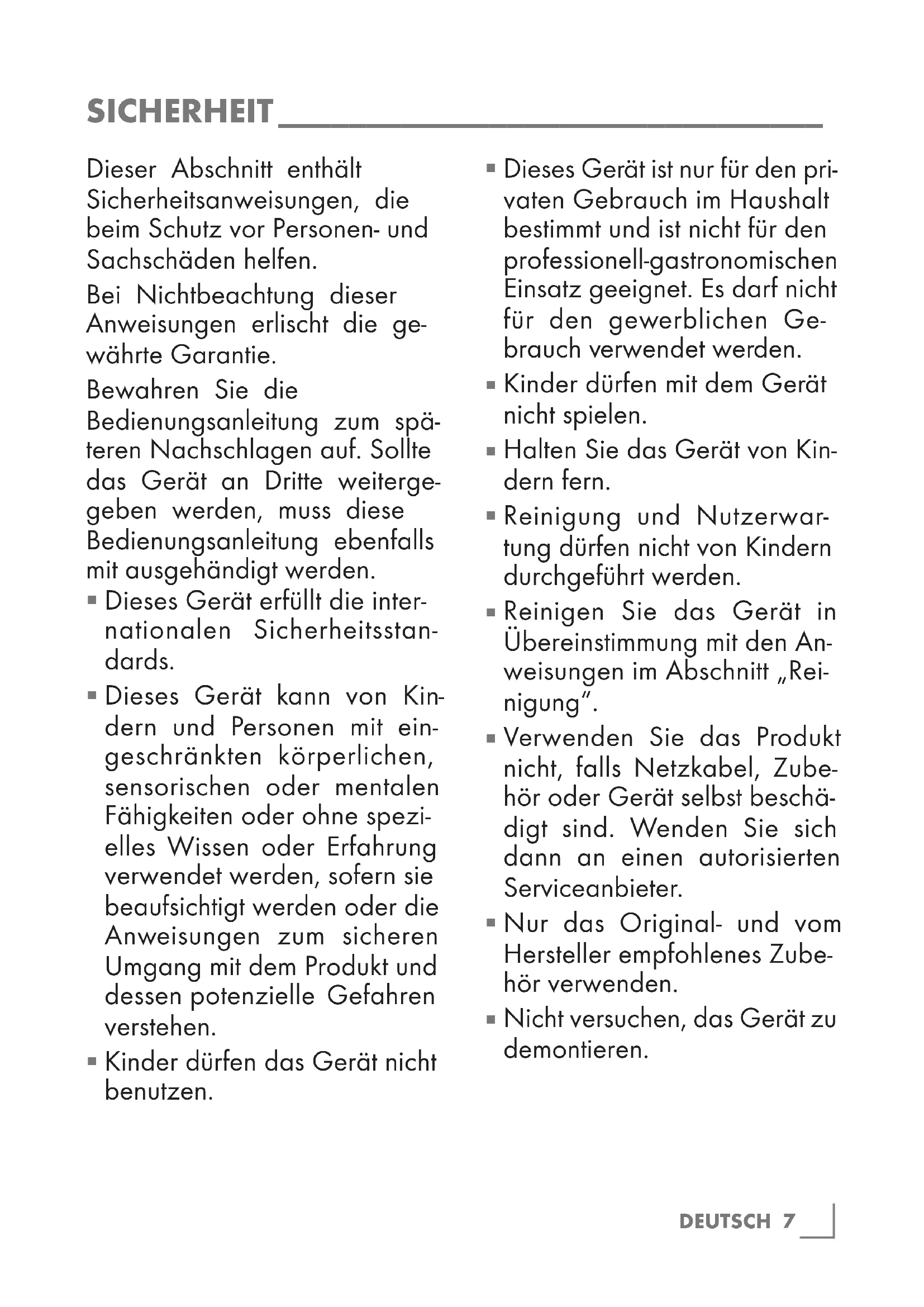 Dieses Gerät ist nur für den pri- vaten Gebrauch im Haushalt bestimmt und ist nicht für den professionell-gastronomischen Einsatz geeignet. Es darf nicht für den gewerblichen Ge- brauch verwendet werden.