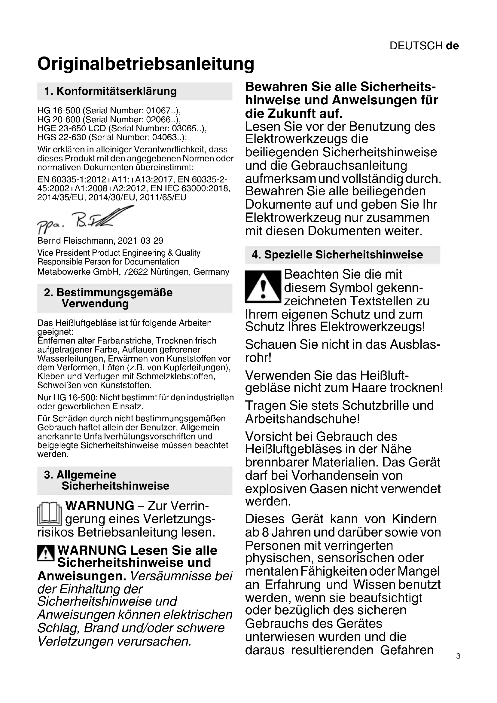 Originalbetriebsanleitung HG 16-500 (Serial Number: 01067..), HG 20-600 (Serial Number: 02066..), HGE 23-650 LCD (Serial Number: 03065..), HGS 22-630 (Serial Number: 04063..): Wir erklären in alleiniger Verantwortlichkeit, dass dieses Produkt mit den angegebenen Normen oder normativen Dokumenten übereinstimmt: EN 60335-1:2012+A11:+A13:2017, EN 60335-2- 45:2002+A1:2008+A2:2012, EN IEC 63000:2018, 2014/35/EU, 2014/30/EU, 2011/65/EU Bernd Fleischmann, 2021-03-29 Vice President Product Engineering & Quality Responsible Person for Documentation Metabowerke GmbH, 72622 Nürtingen, Germany Das Heißluftgebläse ist für folgende Arbeiten geeignet: Entfernen alter Farbanstriche, Trocknen frisch aufgetragener Farbe, Auftauen gefrorener Wasserleitungen, Erwärmen von Kunststoffen vor dem Verformen, Löten (z.B. von Kupferleitungen), Kleben und Verfugen mit Schmelzklebstoffen, Schweißen von Kunststoffen. Nur HG 16-500: Nicht bestimmt für den industriellen oder gewerblichen Einsatz. Für Schäden durch nicht bestimmungsgemäßen Gebrauch haftet allein der Benutzer. Allgemein anerkannte Unfallverhütungsvorschriften und beigelegte Sicherheitshinweise müssen beachtet werden. WARNUNG – Zur Verrin- gerung eines Verletzungs- risikos Betriebsanleitung lesen. WARNUNG Lesen Sie alle Sicherheitshinweise und Anweisungen. Versäumnisse bei der Einhaltung der Sicherheitshinweise und Anweisungen können elektrischen Schlag, Brand und/oder schwere Verletzungen verursachen. Bewahren Sie alle Sicherheits- hinweise und Anweisungen für die Zukunft auf. Lesen Sie vor der Benutzung des Elektrowerkzeugs die beiliegenden Sicherheitshinweise und die Gebrauchsanleitung aufmerksam und vollständig durch. Bewahren Sie alle beiliegenden Dokumente auf und geben Sie Ihr Elektrowerkzeug nur zusammen mit diesen Dokumenten weiter. Beachten Sie die mit diesem Symbol gekenn- zeichneten Textstellen zu Ihrem eigenen Schutz und zum Schutz Ihres Elektrowerkzeugs! Schauen Sie nicht in das Ausblas- rohr! Verwenden Sie das Heißluft- gebläse nicht zum Haare trocknen! Tragen Sie stets Schutzbrille und Arbeitshandschuhe! Vorsicht bei Gebrauch des Heißluftgebläses in der Nähe brennbarer Materialien. Das Gerät darf bei Vorhandensein von explosiven Gasen nicht verwendet werden. Dieses Gerät kann von Kindern ab 8 Jahren und darüber sowie von Personen mit verringerten physischen, sensorischen oder mentalen Fähigkeiten oder Mangel an Erfahrung und Wissen benutzt werden, wenn sie beaufsichtigt oder bezüglich des sicheren Gebrauchs des Gerätes unterwiesen wurden und die daraus resultierenden Gefahren
