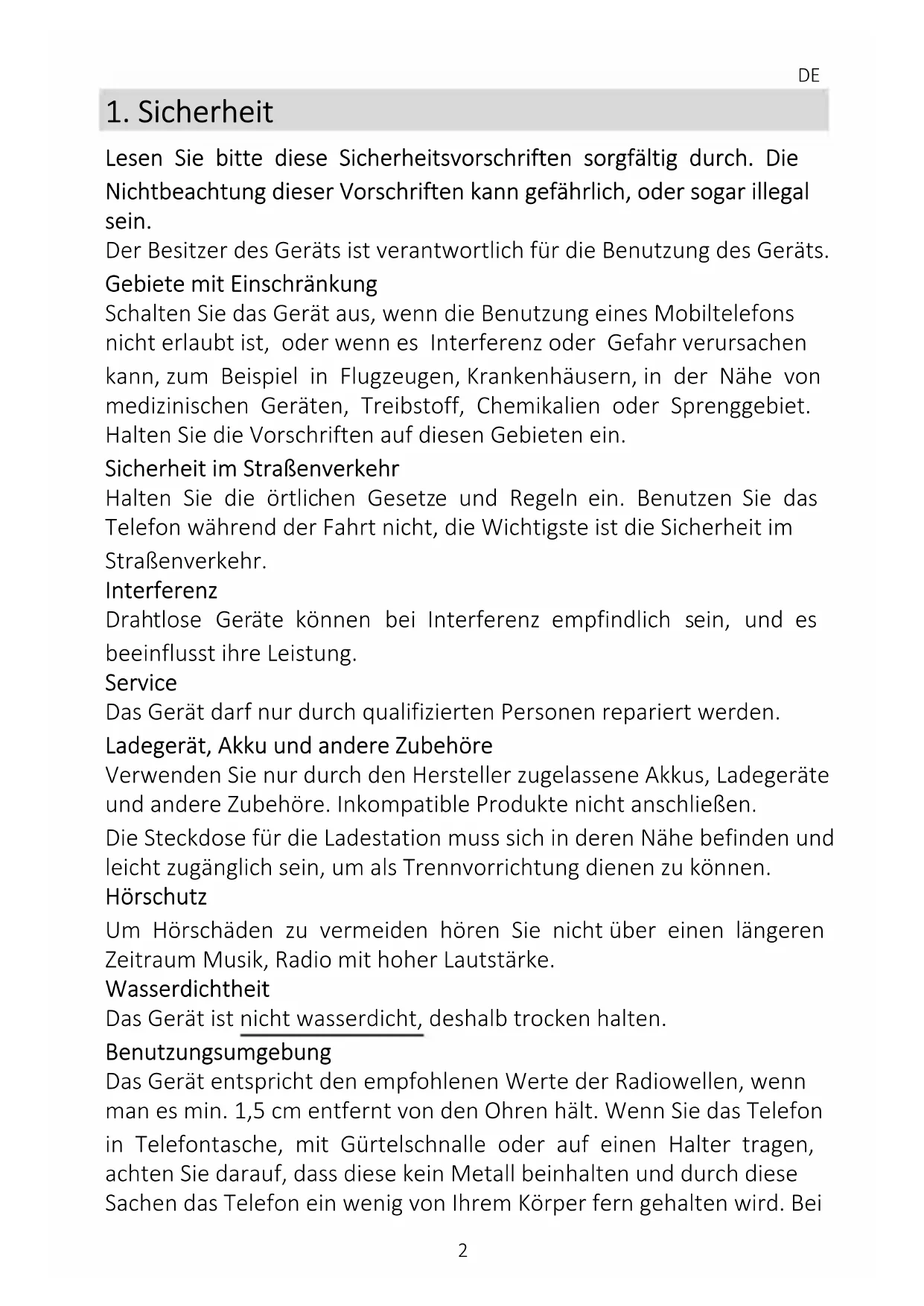 Lesen Sie bitte diese Sicherheitsvorschriften sorgfältig durch. Die Nichtbeachtung dieser Vorschriften kann gefährlich, oder sogar illegal sein. Der Besitzer des Geräts ist verantwortlich für die Benutzung des Geräts. Gebiete mit Einschränkung Schalten Sie das Gerät aus, wenn die Benutzung eines Mobiltelefons nicht erlaubt ist, oder wenn es Interferenz oder Gefahr verursachen kann, zum Beispiel in Flugzeugen, Krankenhäusern, in der Nähe von medizinischen Geräten, Treibstoff, Chemikalien oder Sprenggebiet. Halten Sie die Vorschriften auf diesen Gebieten ein. Sicherheit im Straßenverkehr Halten Sie die örtlichen Gesetze und Regeln ein. Benutzen Sie das Telefon während der Fahrt nicht, die Wichtigste ist die Sicherheit im Straßenverkehr. Interferenz Drahtlose Geräte können bei Interferenz empfindlich sein, und es beeinflusst ihre Leistung. Service Das Gerät darf nur durch qualifizierten Personen repariert werden. Ladegerät, Akku und andere Zubehöre Verwenden Sie nur durch den Hersteller zugelassene Akkus, Ladegeräte und andere Zubehöre. Inkompatible Produkte nicht anschließen. Die Steckdose für die Ladestation muss sich in deren Nähe befinden und leicht zugänglich sein, um als Trennvorrichtung dienen zu können. Hörschutz Um Hörschäden zu vermeiden hören Sie nicht über einen längeren Zeitraum Musik, Radio mit hoher Lautstärke. Wasserdichtheit Das Gerät ist nicht wasserdicht, deshalb trocken halten. Benutzungsumgebung Das Gerät entspricht den empfohlenen Werte der Radiowellen, wenn man es min. 1,5 cm entfernt von den Ohren hält. Wenn Sie das Telefon in Telefontasche, mit Gürtelschnalle oder auf einen Halter tragen, achten Sie darauf, dass diese kein Metall beinhalten und durch diese Sachen das Telefon ein wenig von Ihrem Körper fern gehalten wird. BeiDE