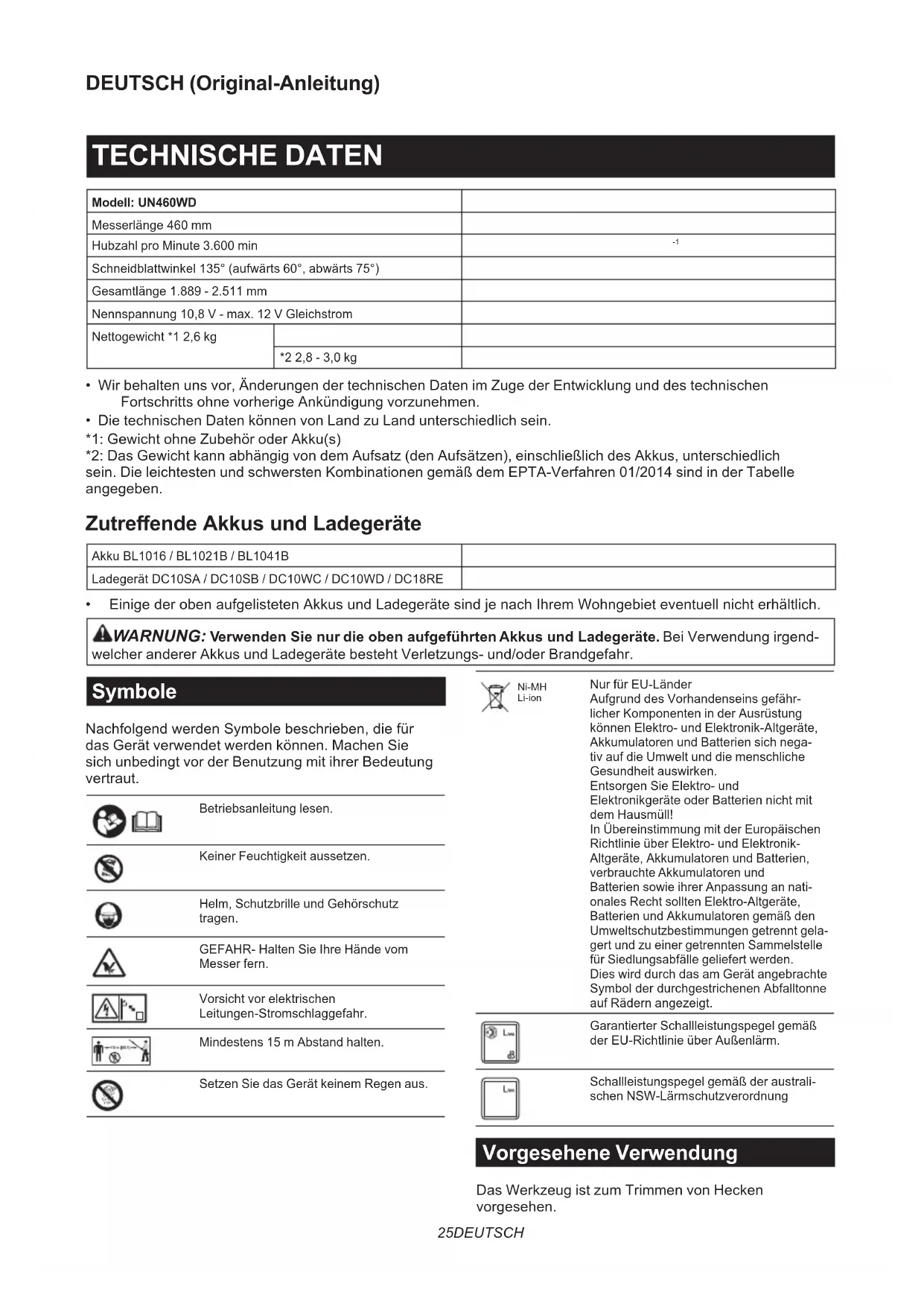 - EinigederobenaufgelistetenAkkusundLadegerätesindjenachIhremWohngebieteventuellnichterhältlich. WARNUNG: Verwenden Sie nur die oben aufgeführten Akkus und Ladegeräte. Bei Verwendung irgend- welcher anderer Akkus und Ladegeräte besteht Verletzungs- und/oder Brandgefahr. Symbole NachfolgendwerdenSymbolebeschrieben,diefür das Gerät verwendet werden können. Machen Sie sich unbedingt vor der Benutzung mit ihrer Bedeutung vertraut. Betriebsanleitung lesen. Keiner Feuchtigkeit aussetzen. Helm, Schutzbrille und Gehörschutz tragen. GEFAHR- Halten Sie Ihre Hände vom Messer fern. Vorsicht vor elektrischen Leitungen-Stromschlaggefahr. Mindestens 15 m Abstand halten. Setzen Sie das Gerät keinem Regen aus. Ni-MH Li-ion Nur für EU-Länder Aufgrund des Vorhandenseins gefähr- licher Komponenten in der Ausrüstung können Elektro- und Elektronik-Altgeräte, Akkumulatoren und Batterien sich nega- tiv auf die Umwelt und die menschliche Gesundheit auswirken. Entsorgen Sie Elektro- und Elektronikgeräte oder Batterien nicht mit dem Hausmüll! In Übereinstimmung mit der Europäischen Richtlinie über Elektro- und Elektronik- Altgeräte, Akkumulatoren und Batterien, verbrauchte Akkumulatoren und Batterien sowie ihrer Anpassung an nati- onales Recht sollten Elektro-Altgeräte, Batterien und Akkumulatoren gemäß den Umweltschutzbestimmungen getrennt gela- gert und zu einer getrennten Sammelstelle für Siedlungsabfälle geliefert werden. Dies wird durch das am Gerät angebrachte SymbolderdurchgestrichenenAbfalltonne auf Rädern angezeigt. Garantierter Schallleistungspegel gemäß der EU-Richtlinie über Außenlärm. Schallleistungspegel gemäß der australi- schen NSW-Lärmschutzverordnung Vorgesehene Verwendung Das Werkzeug ist zum Trimmen von Hecken vorgesehen.26 DEUTSCH Geräusch TypischerA-bewerteterGeräuschpegelermitteltgemäßEN62841-4-2: Schalldruckpegel Garantierter Schallleistungspegel Gemessener Schallleistungspegel