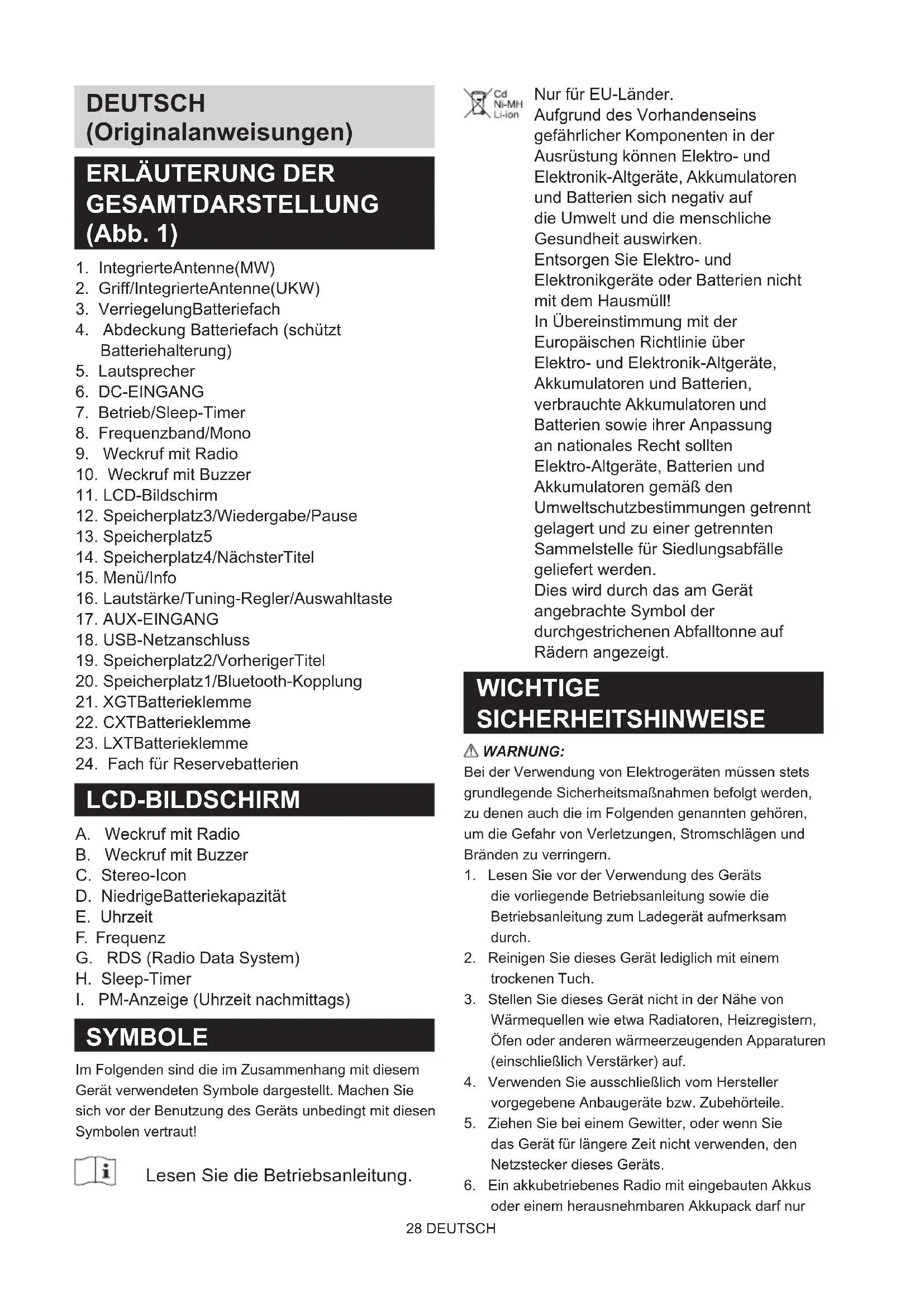 SYMBOLE Im Folgenden sind die im Zusammenhang mit diesem Gerät verwendeten Symbole dargestellt. Machen Sie sich vor der Benutzung des Geräts unbedingt mit diesen Symbolen vertraut! Lesen Sie die Betriebsanleitung. Nur für EU-Länder. Aufgrund des Vorhandenseins gefährlicher Komponenten in der Ausrüstung können Elektro- und Elektronik-Altgeräte, Akkumulatoren und Batterien sich negativ auf die Umwelt und die menschliche Gesundheit auswirken. Entsorgen Sie Elektro- und Elektronikgeräte oder Batterien nicht mit dem Hausmüll! In Übereinstimmung mit der Europäischen Richtlinie über Elektro- und Elektronik-Altgeräte, Akkumulatoren und Batterien, verbrauchte Akkumulatoren und Batterien sowie ihrer Anpassung an nationales Recht sollten Elektro-Altgeräte, Batterien und Akkumulatoren gemäß den Umweltschutzbestimmungen getrennt gelagert und zu einer getrennten Sammelstelle für Siedlungsabfälle geliefert werden. Dies wird durch das am Gerät angebrachte Symbol der durchgestrichenen Abfalltonne auf Rädern angezeigt. WICHTIGE SICHERHEITSHINWEISE WARNUNG: Bei der Verwendung von Elektrogeräten müssen stets grundlegende Sicherheitsmaßnahmen befolgt werden, zu denen auch die im Folgenden genannten gehören, um die Gefahr von Verletzungen, Stromschlägen und Bränden zu verringern.