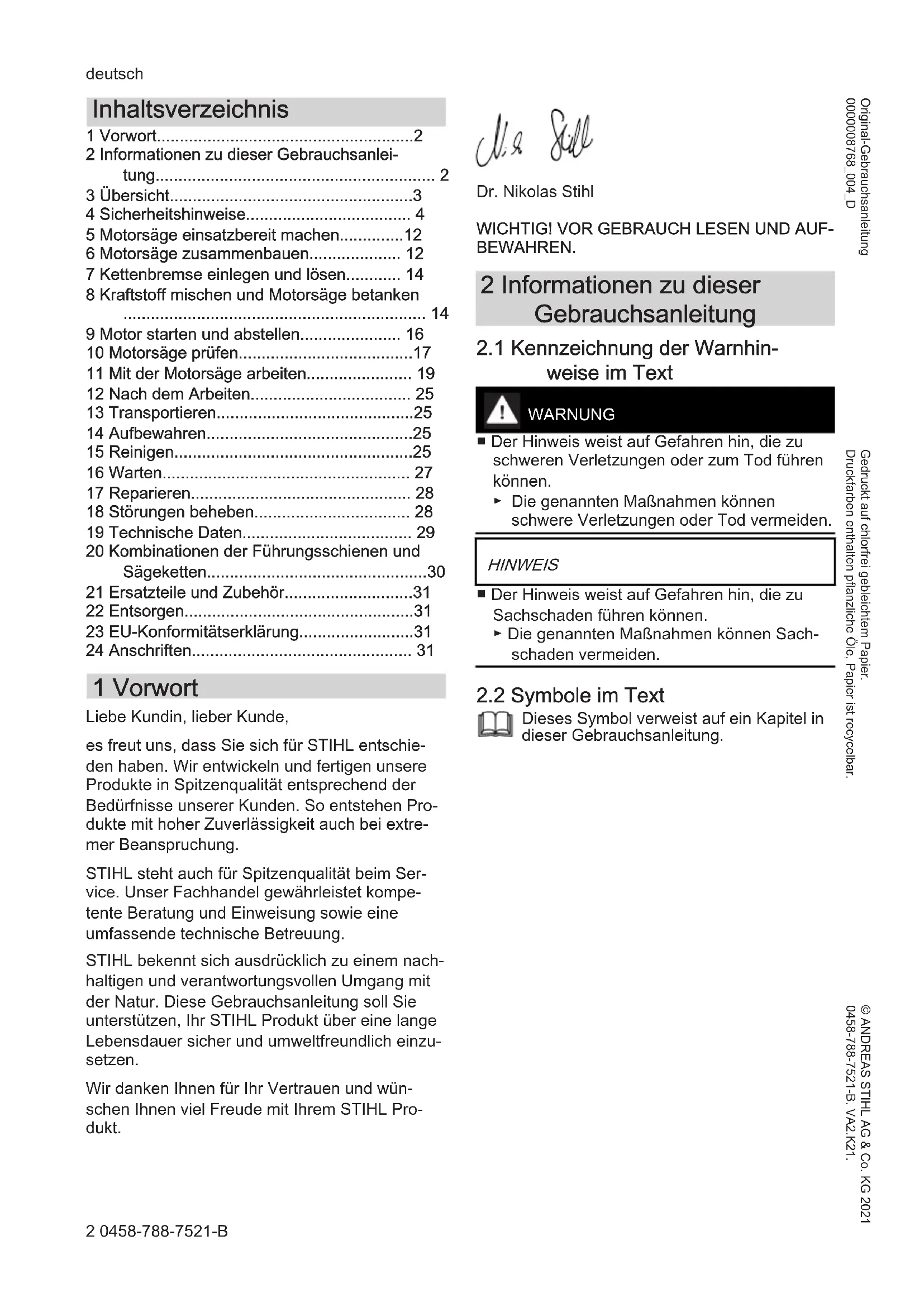 - 24 Anschriften 1 Vorwort Liebe Kundin, lieber Kunde, es freut uns, dass Sie sich für STIHL entschie‐ den haben. Wir entwickeln und fertigen unsere Produkte in Spitzenqualität entsprechend der Bedürfnisse unserer Kunden. So entstehen Pro‐ dukte mit hoher Zuverlässigkeit auch bei extre‐ mer Beanspruchung. STIHL steht auch für Spitzenqualität beim Ser‐ vice. Unser Fachhandel gewährleistet kompe‐ tente Beratung und Einweisung sowie eine umfassende technische Betreuung. STIHL bekennt sich ausdrücklich zu einem nach‐ haltigen und verantwortungsvollen Umgang mit der Natur. Diese Gebrauchsanleitung soll Sie unterstützen, Ihr STIHL Produkt über eine lange Lebensdauer sicher und umweltfreundlich einzu‐ setzen. Wir danken Ihnen für Ihr Vertrauen und wün‐ schen Ihnen viel Freude mit Ihrem STIHL Pro‐ dukt. Dr. Nikolas Stihl p. 31