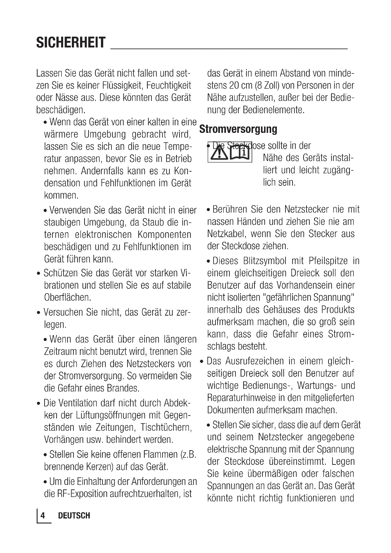 - Um die Einhaltung der Anforderungen an die RF-Exposition aufrechtzuerhalten, ist das Gerät in einem Abstand von minde- stens 20 cm (8 Zoll) von Personen in der Nähe aufzustellen, außer bei der Bedie- nung der Bedienelemente. Stromversorgung