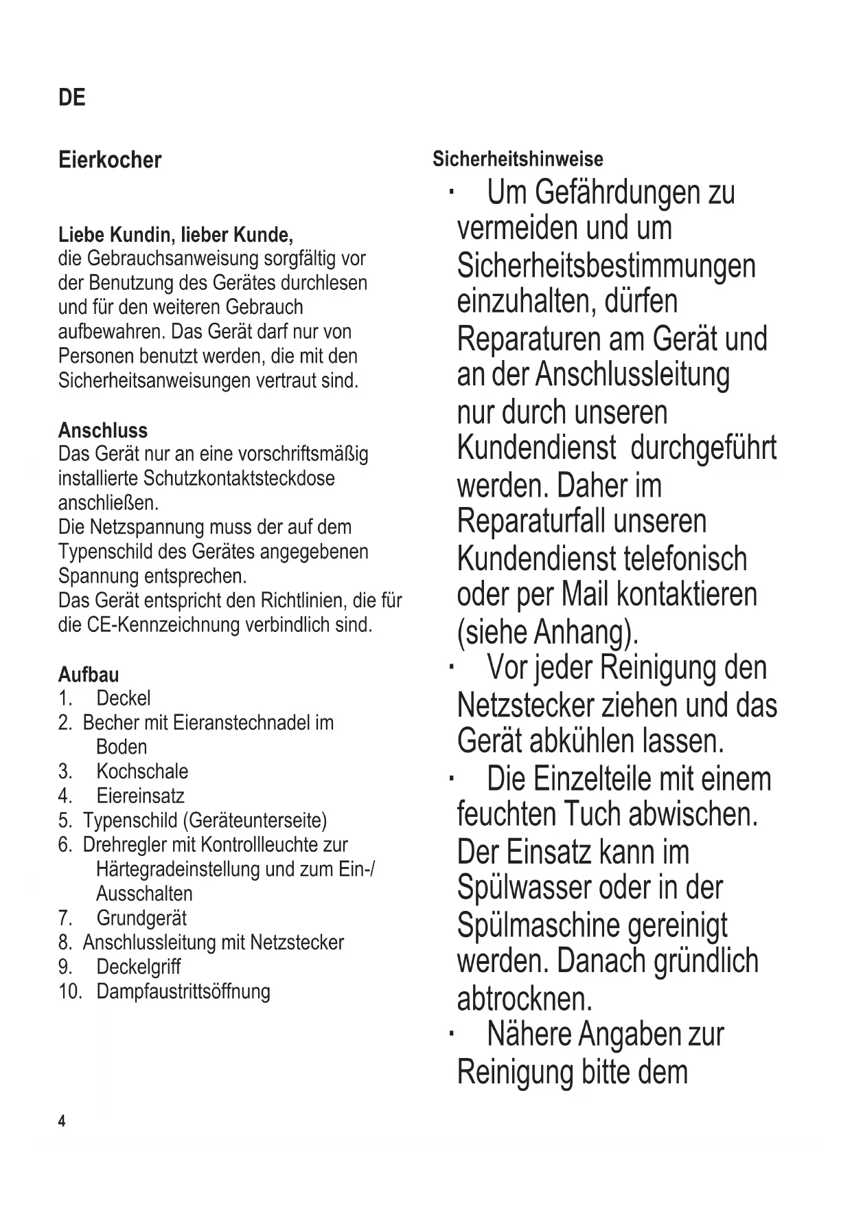 104 x 142 mm Eierkocher Liebe Kundin, lieber Kunde, die Gebrauchsanweisung sorgfältig vor der Benutzung des Gerätes durchlesen und für den weiteren Gebrauch aufbewahren. Das Gerät darf nur von Personen benutzt werden, die mit den Sicherheitsanweisungen vertraut sind. Anschluss Das Gerät nur an eine vorschriftsmäßig installierte Schutzkontaktsteckdose anschließen. Die Netzspannung muss der auf dem Typenschild des Gerätes angegebenen Spannung entsprechen. Das Gerät entspricht den Richtlinien, die für die CE-Kennzeichnung verbindlich sind. Aufbau