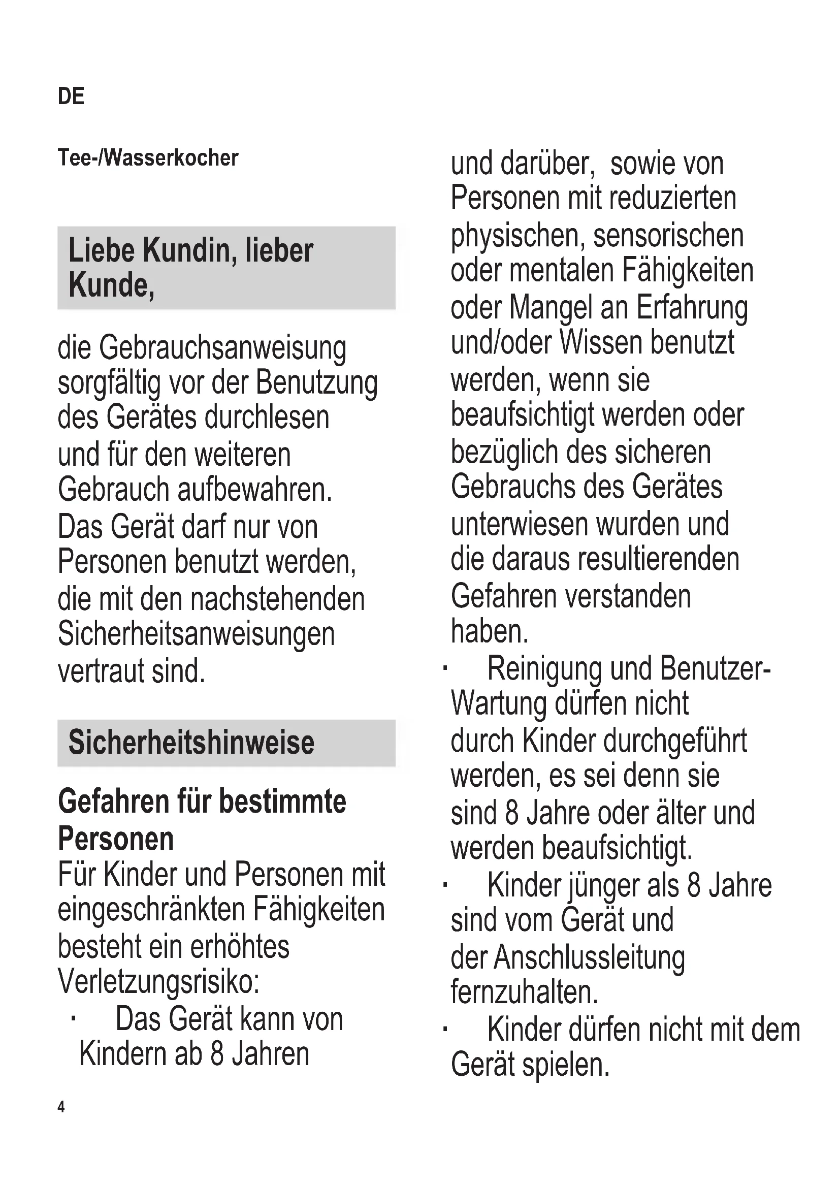 104 x 142 mm Tee-/Wasserkocher Liebe Kundin, lieber Kunde, die Gebrauchsanweisung sorgfältig vor der Benutzung des Gerätes durchlesen und für den weiteren Gebrauch aufbewahren. Das Gerät darf nur von Personen benutzt werden, die mit den nachstehenden Sicherheitsanweisungen vertraut sind. Sicherheitshinweise Gefahren für bestimmte Personen Für Kinder und Personen mit eingeschränkten Fähigkeiten besteht ein erhöhtes Verletzungsrisiko: ∙ Das Gerät kann von Kindern ab 8 Jahren und darüber, sowie von Personen mit reduzierten physischen, sensorischen oder mentalen Fähigkeiten oder Mangel an Erfahrung und/oder Wissen benutzt werden, wenn sie beaufsichtigt werden oder bezüglich des sicheren Gebrauchs des Gerätes unterwiesen wurden und die daraus resultierenden Gefahren verstanden haben. ∙ Reinigung und Benutzer- Wartung dürfen nicht durch Kinder durchgeführt werden, es sei denn sie sind 8 Jahre oder älter und werden beaufsichtigt. ∙ Kinder jünger als 8 Jahre sind vom Gerät und der Anschlussleitung fernzuhalten. ∙ Kinder dürfen nicht mit dem Gerät spielen. DE104 x 142 mm