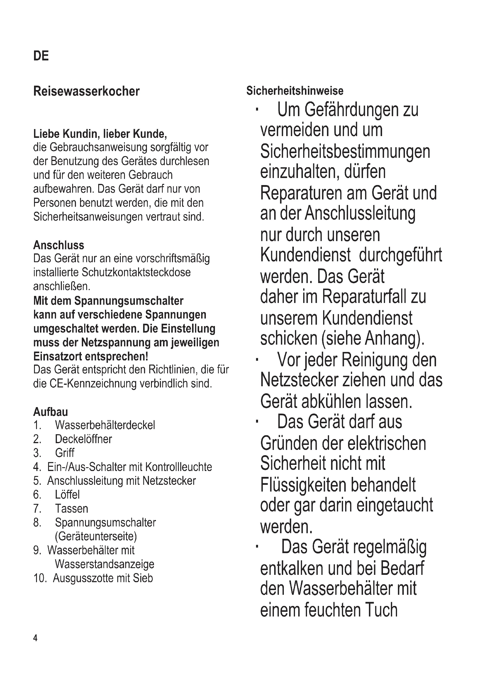 104 x 142 mm Reisewasserkocher Liebe Kundin, lieber Kunde, die Gebrauchsanweisung sorgfältig vor der Benutzung des Gerätes durchlesen und für den weiteren Gebrauch aufbewahren. Das Gerät darf nur von Personen benutzt werden, die mit den Sicherheitsanweisungen vertraut sind. Anschluss Das Gerät nur an eine vorschriftsmäßig installierte Schutzkontaktsteckdose anschließen. Mit dem Spannungsumschalter kann auf verschiedene Spannungen umgeschaltet werden. Die Einstellung muss der Netzspannung am jeweiligen Einsatzort entsprechen! Das Gerät entspricht den Richtlinien, die für die CE-Kennzeichnung verbindlich sind. Aufbau