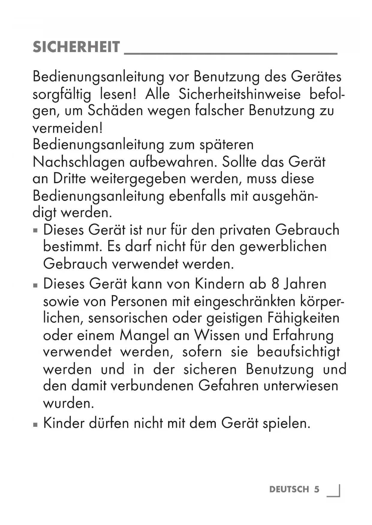 SICHERHEIT __________________________ Bedienungsanleitung vor Benutzung des Gerätes sorgfältig lesen! Alle Sicherheitshinweise befol- gen, um Schäden wegen falscher Benutzung zu vermeiden! Bedienungsanleitung zum späteren Nachschlagen aufbewahren. Sollte das Gerät an Dritte weitergegeben werden, muss diese Bedienungsanleitung ebenfalls mit ausgehän- digt werden.