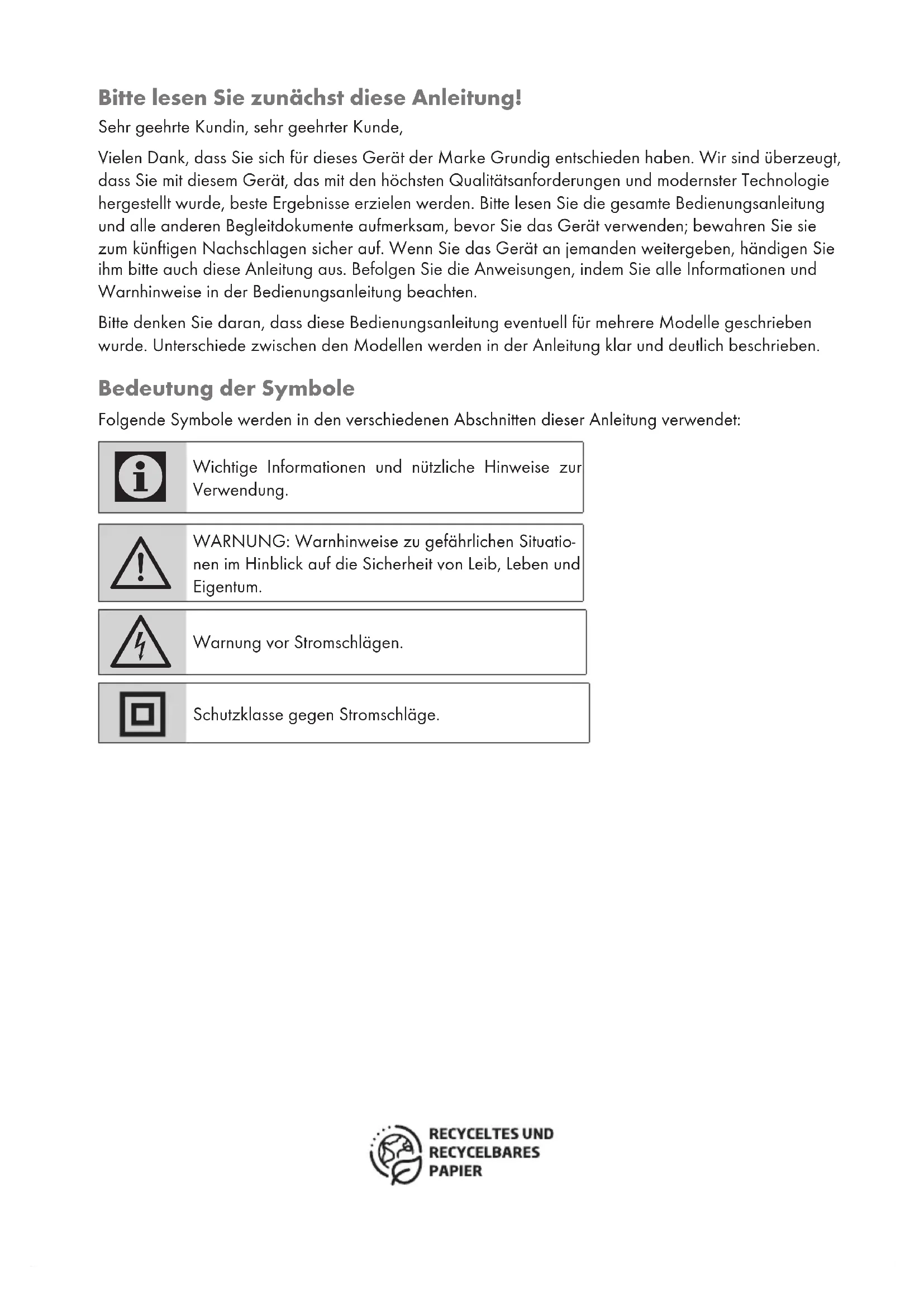 -----------------------------------------------------------------------------------------------------------------------------------------------------------------------------Bitte lesen Sie zunächst diese Anleitung! Sehr geehrte Kundin, sehr geehrter Kunde, Vielen Dank, dass Sie sich für dieses Gerät der Marke Grundig entschieden haben. Wir sind überzeugt, dass Sie mit diesem Gerät, das mit den höchsten Qualitätsanforderungen und modernster Technologie hergestellt wurde, beste Ergebnisse erzielen werden. Bitte lesen Sie die gesamte Bedienungsanleitung und alle anderen Begleitdokumente aufmerksam, bevor Sie das Gerät verwenden; bewahren Sie sie zum künftigen Nachschlagen sicher auf. Wenn Sie das Gerät an jemanden weitergeben, händigen Sie ihm bitte auch diese Anleitung aus. Befolgen Sie die Anweisungen, indem Sie alle Informationen und Warnhinweise in der Bedienungsanleitung beachten. Bitte denken Sie daran, dass diese Bedienungsanleitung eventuell für mehrere Modelle geschrieben wurde. Unterschiede zwischen den Modellen werden in der Anleitung klar und deutlich beschrieben. Bedeutung der Symbole Folgende Symbole werden in den verschiedenen Abschnitten dieser Anleitung verwendet: