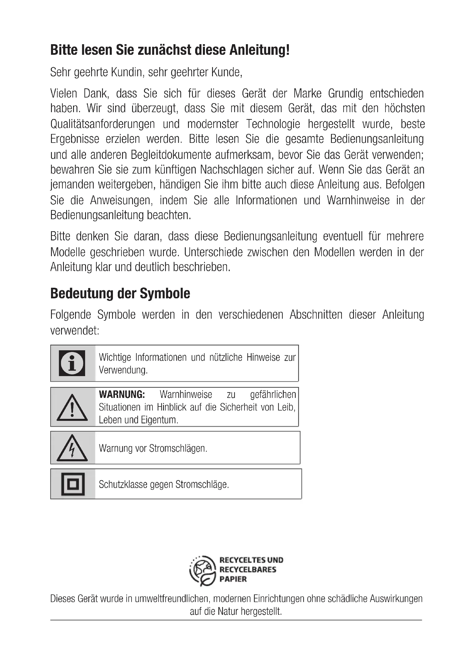 Warnung vor Stromschlägen. Schutzklasse gegen Stromschläge. Dieses Gerät wurde in umweltfreundlichen, modernen Einrichtungen ohne schädliche Auswirkungen auf die Natur hergestellt.9 DEUTSCH zum künftigen Nachschlagen aufbewahrt werden.