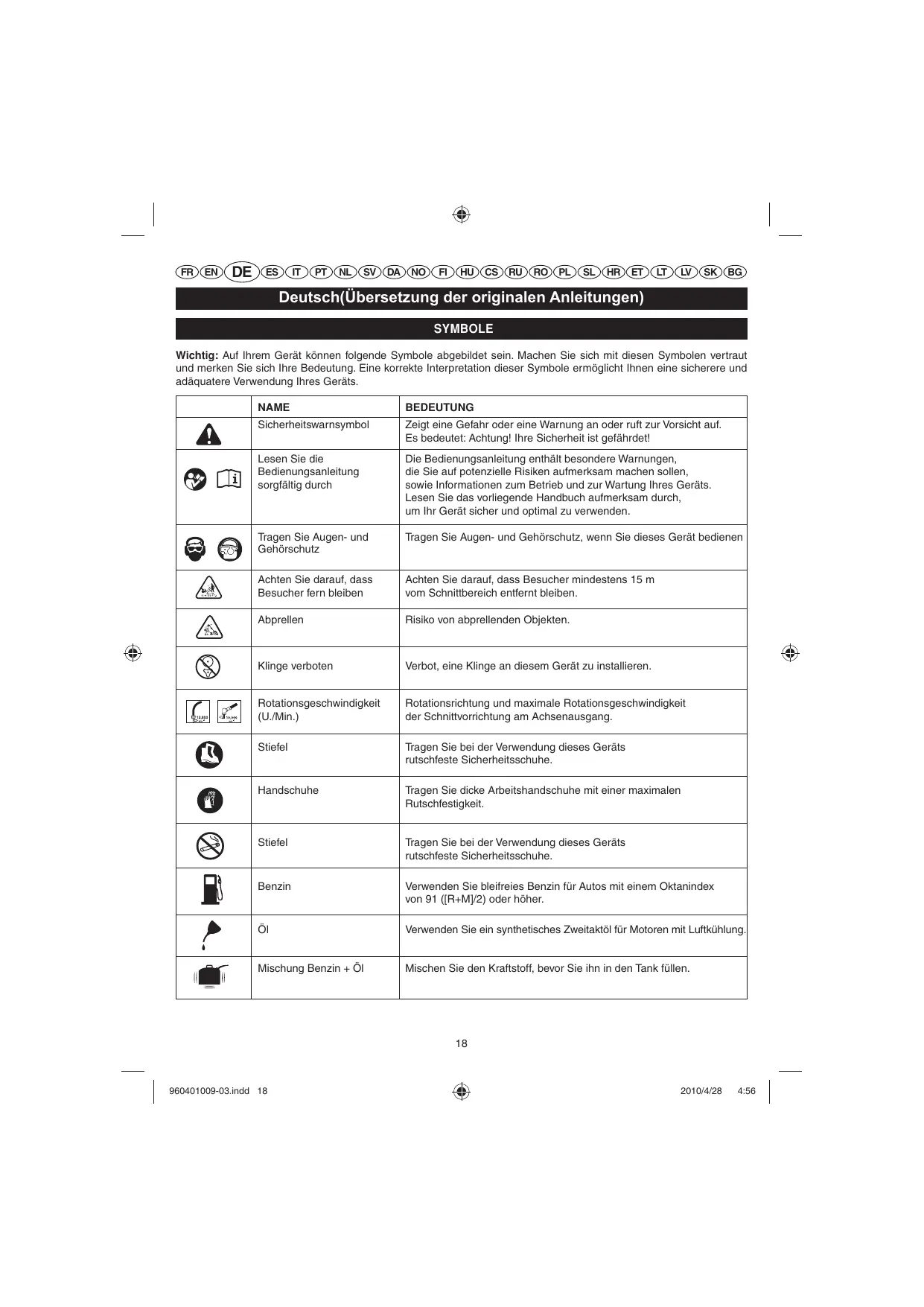 Deutsch(Übersetzung der originalen Anleitungen) SYMBOLE Wichtig: Auf Ihrem Gerät können folgende Symbole abgebildet sein. Machen Sie sich mit diesen Symbolen vertraut und merken Sie sich Ihre Bedeutung. Eine korrekte Interpretation dieser Symbole ermöglicht Ihnen eine sicherere und adäquatere Verwendung Ihres Geräts. NAME BEDEUTUNG Sicherheitswarnsymbol Zeigt eine Gefahr oder eine Warnung an oder ruft zur Vorsicht auf. Es bedeutet: Achtung! Ihre Sicherheit ist gefährdet! Lesen Sie die Bedienungsanleitung sorgfältig durch Die Bedienungsanleitung enthält besondere Warnungen, die Sie auf potenzielle Risiken aufmerksam machen sollen, sowie Informationen zum Betrieb und zur Wartung Ihres Geräts. Lesen Sie das vorliegende Handbuch aufmerksam durch, um Ihr Gerät sicher und optimal zu verwenden. Tragen Sie Augen- und Gehörschutz Tragen Sie Augen- und Gehörschutz, wenn Sie dieses Gerät bedienen Achten Sie darauf, dass Besucher fern bleiben Achten Sie darauf, dass Besucher mindestens 15 m vom Schnittbereich entfernt bleiben. Abprellen Risiko von abprellenden Objekten. Klinge verboten Verbot, eine Klinge an diesem Gerät zu installieren. Rotationsgeschwindigkeit (U./Min.) Rotationsrichtung und maximale Rotationsgeschwindigkeit der Schnittvorrichtung am Achsenausgang. Stiefel Tragen Sie bei der Verwendung dieses Geräts rutschfeste Sicherheitsschuhe. Handschuhe Tragen Sie dicke Arbeitshandschuhe mit einer maximalen Rutschfestigkeit. Stiefel Tragen Sie bei der Verwendung dieses Geräts rutschfeste Sicherheitsschuhe. Benzin Verwenden Sie bleifreies Benzin für Autos mit einem Oktanindex von 91 ([R+M]/2) oder höher.