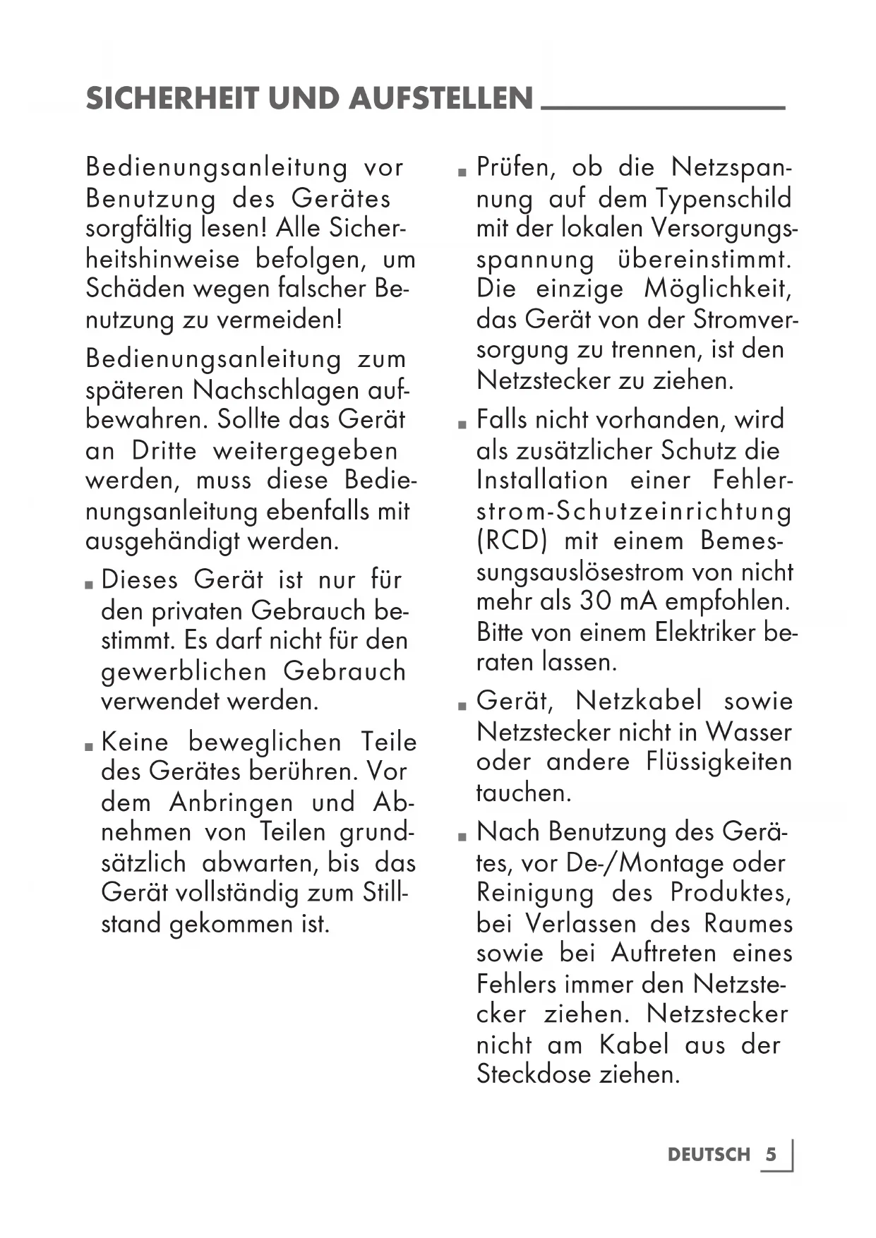 Nach Benutzung des Gerä- tes, vor De-/Montage oder Reinigung des Produktes, bei Verlassen des Raumes sowie bei Auftreten eines Fehlers immer den Netzste- cker ziehen. Netzstecker nicht am Kabel aus der Steckdose ziehen.6 DEUTSC H