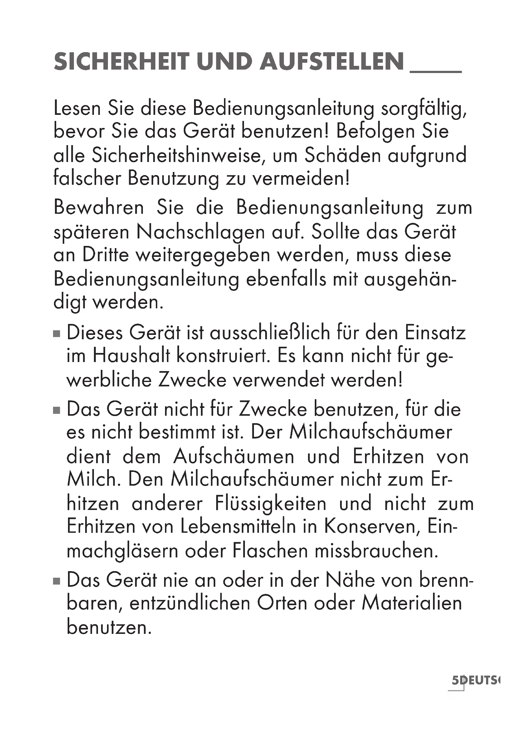 Das Gerät nicht für Zwecke benutzen, für die es nicht bestimmt ist. Der Milchaufschäumer dient dem Aufschäumen und Erhitzen von Milch. Den Milchaufschäumer nicht zum Er- hitzen anderer Flüssigkeiten und nicht zum Erhitzen von Lebensmitteln in Konserven, Ein- machgläsern oder Flaschen missbrauchen.