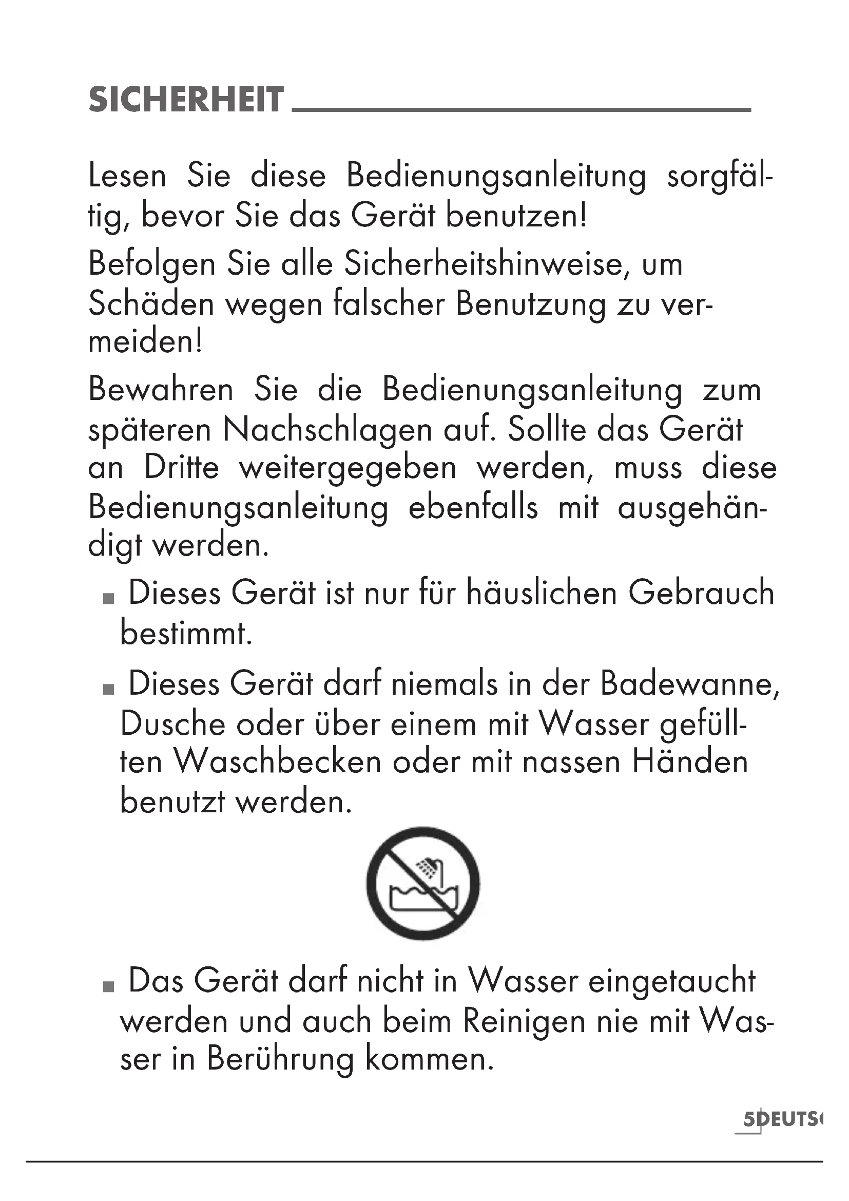 Das Gerät darf nicht in Wasser eingetaucht werden und auch beim Reinigen nie mit Was- ser in Berührung kommen.6 DEUTSCH SICHERHEIT