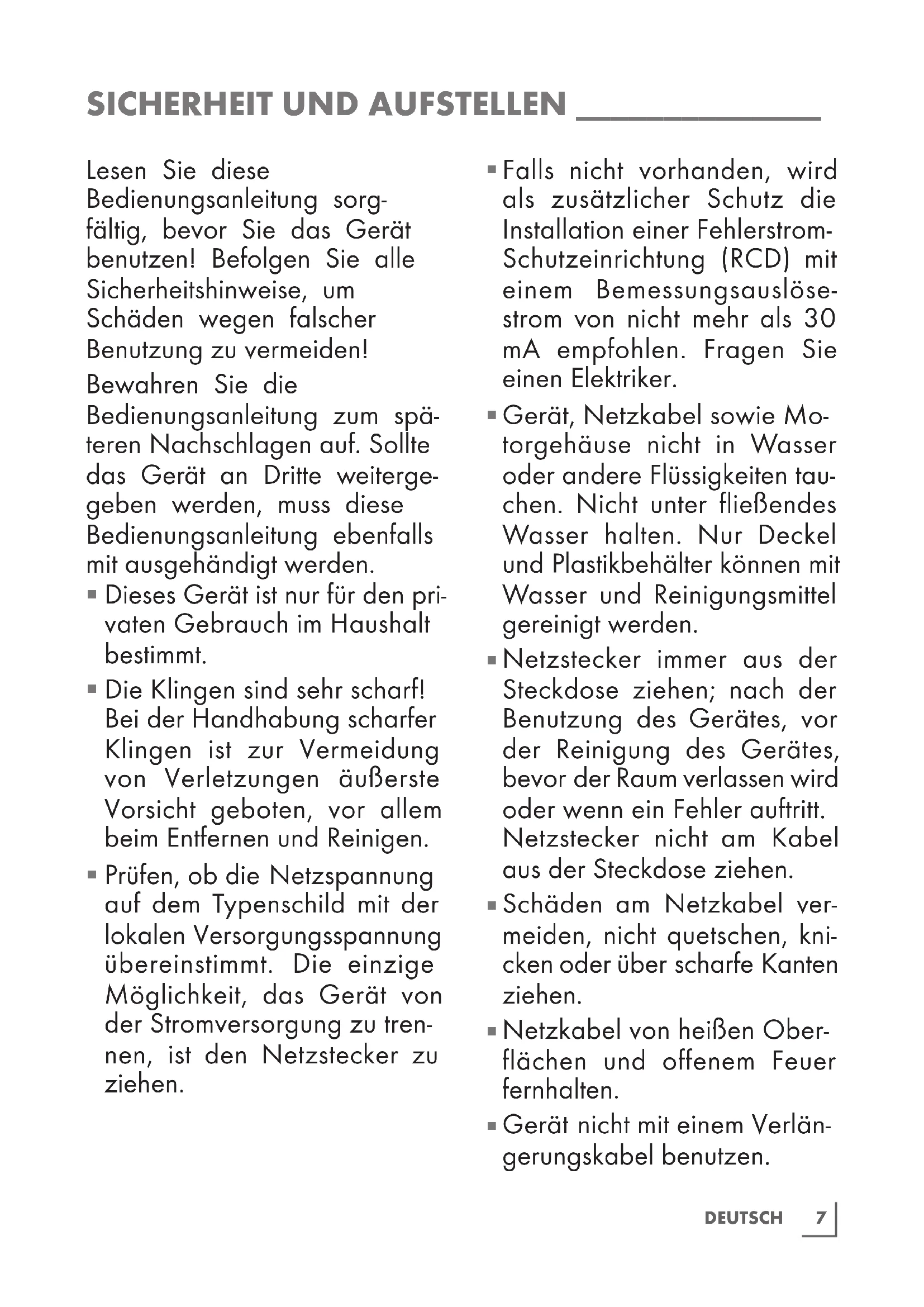 Gerät, Netzkabel sowie Mo- torgehäuse nicht in Wasser oder andere Flüssigkeiten tau- chen. Nicht unter fließendes Wasser halten. Nur Deckel und Plastikbehälter können mit Wasser und Reinigungsmittel gereinigt werden.