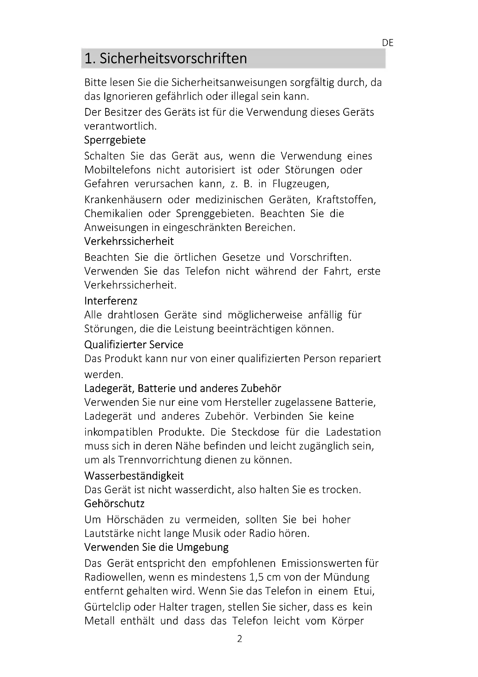 Bitte lesen Sie die Sicherheitsanweisungen sorgfältig durch, da das Ignorieren gefährlich oder illegal sein kann. Der Besitzer des Geräts ist für die Verwendung dieses Geräts verantwortlich. Sperrgebiete Schalten Sie das Gerät aus, wenn die Verwendung eines Mobiltelefons nicht autorisiert ist oder Störungen oder Gefahren verursachen kann, z. B. in Flugzeugen, Krankenhäusern oder medizinischen Geräten, Kraftstoffen, Chemikalien oder Sprenggebieten. Beachten Sie die Anweisungen in eingeschränkten Bereichen. Verkehrssicherheit Beachten Sie die örtlichen Gesetze und Vorschriften. Verwenden Sie das Telefon nicht während der Fahrt, erste Verkehrssicherheit. Interferenz Alle drahtlosen Geräte sind möglicherweise anfällig für Störungen, die die Leistung beeinträchtigen können. Qualifizierter Service Das Produkt kann nur von einer qualifizierten Person repariert werden. Ladegerät, Batterie und anderes Zubehör Verwenden Sie nur eine vom Hersteller zugelassene Batterie, Ladegerät und anderes Zubehör. Verbinden Sie keine inkompatiblen Produkte. Die Steckdose für die Ladestation muss sich in deren Nähe befinden und leicht zugänglich sein, um als Trennvorrichtung dienen zu können. Wasserbeständigkeit Das Gerät ist nicht wasserdicht, also halten Sie es trocken. Gehörschutz Um Hörschäden zu vermeiden, sollten Sie bei hoher Lautstärke nicht lange Musik oder Radio hören. Verwenden Sie die Umgebung Das Gerät entspricht den empfohlenen Emissionswerten für Radiowellen, wenn es mindestens 1,5 cm von der Mündung entfernt gehalten wird. Wenn Sie das Telefon in einem Etui, Gürtelclip oder Halter tragen, stellen Sie sicher, dass es kein Metall enthält und dass das Telefon leicht vom KörperDE