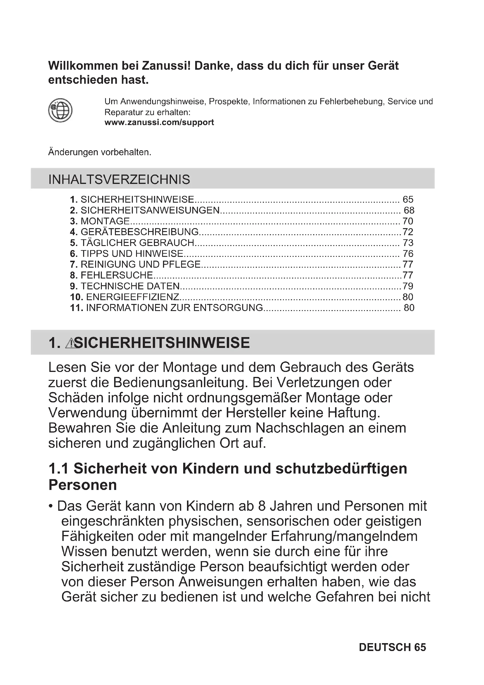 Ihre Pflichten als Endnutzer Dieses Elektro- bzw. Elektronikgerät ist mit einer durchgestrichenen Abfalltonne auf Rädern gekennzeichnet. Das Gerät darf deshalb nur getrennt vom unsortierten Siedlungsabfall gesammelt und zurückgenommen werden, es darf also nicht in den Hausmüll gegeben werden. Das Gerät kann z. B. bei einer kommunalen Sammelstelle oder ggf. bei einem Vertreiber (siehe zu deren Rücknahmepflichten unten) abgegeben werden. Das gilt auch für alle Bauteile, Unterbaugruppen und Verbrauchsmaterialien des zu entsorgenden Altgeräts. Bevor das Altgerät entsorgt werden darf, müssen alle Altbatterien und Altakkumulatoren vom Altgerät getrennt werden, die nicht vom Altgerät umschlossen sind. Das gleiche gilt für Lampen, die zerstörungsfrei aus dem Altgerät entnommen werden können. Der Endnutzer ist zudem selbst dafür verantwortlich, personenbezogene Daten auf dem Altgerät zu löschen. 80 DEUTSCHHinweise zum Recycling Helfen Sie mit, alle Materialien zu recyceln, die mit diesem Symbol gekennzeichnet sind. Entsorgen Sie solche Materialien, insbesondere Verpackungen, nicht im Hausmüll sondern über die bereitgestellten Recyclingbehälter oder die entsprechenden örtlichen Sammelsysteme. Recyceln Sie zum Umwelt- und Gesundheitsschutz auch elektrische und elektronische Geräte. Rücknahmepflichten der Vertreiber in Deutschland Wer auf mindestens 400 m² Verkaufsfläche Elektro- und Elektronikgeräte vertreibt oder sonst geschäftlich an Endnutzer abgibt, ist verpflichtet, bei Abgabe eines neuen Geräts ein Altgerät des Endnutzers der gleichen Geräteart, das im Wesentlichen die gleichen Funktionen wie das neue Gerät erfüllt, am Ort der Abgabe oder in unmittelbarer Nähe hierzu unentgeltlich zurückzunehmen. Das gilt auch für Vertreiber von Lebensmitteln mit einer Gesamtverkaufsfläche von mindestens 800 m², die mehrmals im Kalenderjahr oder dauerhaft Elektro- und Elektronikgeräte anbieten und auf dem Markt bereitstellen. Solche Vertreiber müssen zudem auf Verlangen des Endnutzers Altgeräte, die in keiner äußeren Abmessung größer als 25 cm sind (kleine Elektrogeräte), im Einzelhandelsgeschäft oder in unmittelbarer Nähe hierzu unentgeltlich zurückzunehmen; die Rücknahme darf in diesem Fall nicht an den Kauf eines Elektro- oder Elektronikgerätes geknüpft, kann aber auf drei Altgeräte pro Geräteart beschränkt werden. Ort der Abgabe ist auch der private Haushalt, wenn das neue Elektro- oder Elektronikgerät dorthin geliefert wird; in diesem Fall ist die Abholung des Altgerätes für den Endnutzer kostenlos. Die vorstehenden Pflichten gelten auch für den Vertrieb unter Verwendung von Fernkommunikationsmitteln, wenn die Vertreiber Lager- und Versandflächen für Elektro- und Elektronikgeräte bzw. Gesamtlager- und -versandflächen für Lebensmittel vorhalten, die den oben genannten Verkaufsflächen entsprechen. Die unentgeltliche Abholung von Elektro- und Elektronikgeräten ist dann aber auf Wärmeüberträger (z. B. Kühlschrank), Bildschirme, Monitore und Geräte, die Bildschirme mit einer Oberfläche von mehr als 100 cm² enthalten, und Geräte beschränkt, bei denen mindestens eine der äußeren Abmessungen mehr als 50 cm beträgt. Für alle übrigen Elektro- und Elektronikgeräte muss der Vertreiber geeignete Rückgabemöglichkeiten in zumutbarer Entfernung zum jeweiligen Endnutzer gewährleisten; das gilt auch für kleine Elektrogeräte (s.o.), die der Endnutzer zurückgeben will, ohne ein neues Gerät zu kaufen. Rücknahmepflichten von Vertreibern und andere Möglichkeiten der Entsorgung von Elektro- und Elektronikgeräten in der Region Wallonien Vertreiber, die Elektro- und Elektronikgeräte verkaufen, sind verpflichtet, bei der Lieferung von Neugeräten Altgeräte desselben Typs, die im Wesentlichen die gleichen Funktionen wie die Neugeräte erfüllen, kostenlos vom Endverbraucher zurückzunehmen. Dies gilt auch bei der Lieferung von neuen Elektro- und Elektronikgeräten oder beim Fernabsatz. Darüber hinaus ist jeder, der Elektro- und Elektronikgeräte auf einer Verkaufsfläche von mindestens 400 m² verkauft, verpflichtet, Altgeräte, die in keiner äußeren Abmessung größer als 25 cm sind (Elektrokleingeräte), im Ladengeschäft oder in unmittelbarer Nähe kostenlos zurückzunehmen; die Rücknahme darf in diesem Fall nicht vom Kauf eines Elektro- oder Elektronikgerätes abhängig gemacht werden. Die Rücknahme von Elektro- und Elektronikgeräten kann auch auf Containerplätzen oder zugelassenen Recyclinghöfen erfolgen. Für weitere Informationen wenden Sie sich bitte an Ihre Gemeindeverwaltung. DEUTSCH 81Bem-vindo(a) à Zanussi! Obrigado por escolher o nosso aparelho. Obter conselhos de utilização, folhetos, resolução de problemas e informações sobreassistência e reparações:www.zanussi.com/supportSujeito a alterações sem aviso prévio. ÍNDICE 1. INFORMAÇÕES DE SEGURANÇA..............................................................822. INSTRUÇÕES DE SEGURANÇA................................................................. 85