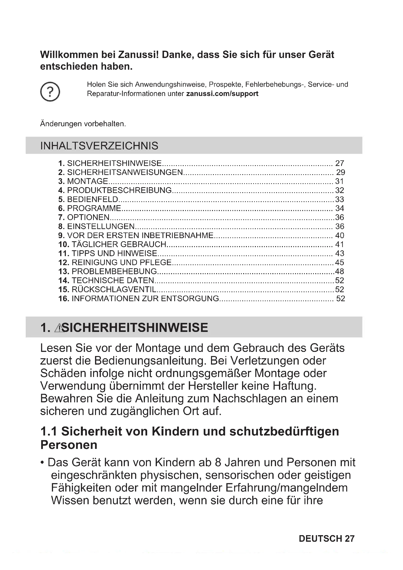 - Das Gerät kann von Kindern ab 8 Jahren und Personen mit eingeschränkten physischen, sensorischen oder geistigen Fähigkeiten oder mit mangelnder Erfahrung/mangelndem Wissen benutzt werden, wenn sie durch eine für ihre DEUTSCH 27Sicherheit zuständige Person beaufsichtigt werden oder von dieser Person Anweisungen erhalten haben, wie das Gerät sicher zu bedienen ist und welche Gefahren bei nicht ordnungsgemäßer Bedienung bestehen.