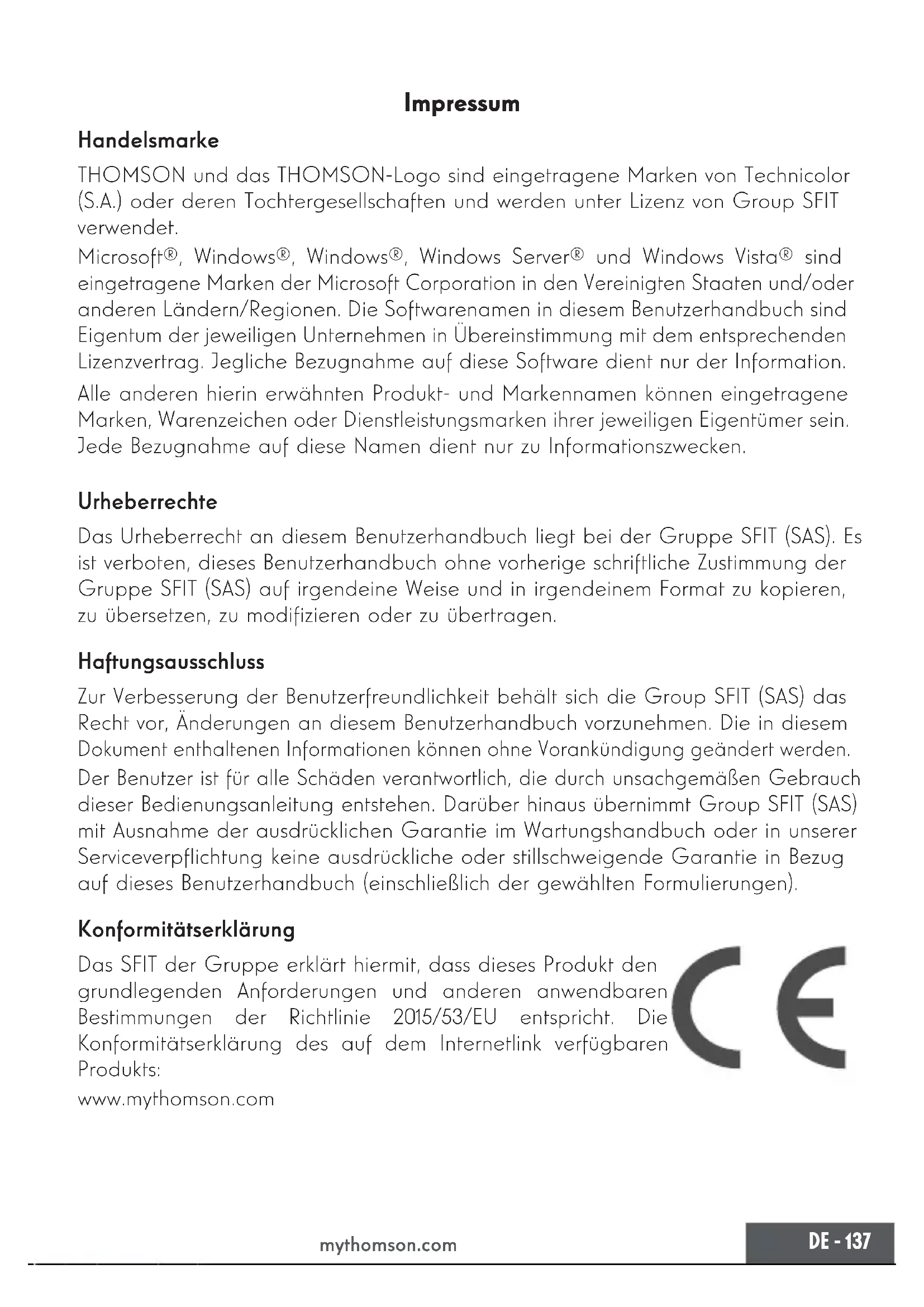 mythomson.com Impressum Handelsmarke THOMSON und das THOMSON-Logo sind eingetragene Marken von Technicolor (S.A.) oder deren Tochtergesellschaften und werden unter Lizenz von Group SFIT verwendet. Microsoft®, Windows®, Windows®, Windows Server® und Windows Vista® sind eingetragene Marken der Microsoft Corporation in den Vereinigten Staaten und/oder anderen Ländern/Regionen. Die Softwarenamen in diesem Benutzerhandbuch sind Eigentum der jeweiligen Unternehmen in Übereinstimmung mit dem entsprechenden Lizenzvertrag. Jegliche Bezugnahme auf diese Software dient nur der Information. Alle anderen hierin erwähnten Produkt- und Markennamen können eingetragene Marken, Warenzeichen oder Dienstleistungsmarken ihrer jeweiligen Eigentümer sein. Jede Bezugnahme auf diese Namen dient nur zu Informationszwecken. Urheberrechte Das Urheberrecht an diesem Benutzerhandbuch liegt bei der Gruppe SFIT (SAS). Es ist verboten, dieses Benutzerhandbuch ohne vorherige schriftliche Zustimmung der Gruppe SFIT (SAS) auf irgendeine Weise und in irgendeinem Format zu kopieren, zu übersetzen, zu modizieren oder zu übertragen. Haftungsausschluss Zur Verbesserung der Benutzerfreundlichkeit behält sich die Group SFIT (SAS) das Recht vor, Änderungen an diesem Benutzerhandbuch vorzunehmen. Die in diesem Dokument enthaltenen Informationen können ohne Vorankündigung geändert werden. Der Benutzer ist für alle Schäden verantwortlich, die durch unsachgemäßen Gebrauch dieser Bedienungsanleitung entstehen. Darüber hinaus übernimmt Group SFIT (SAS) mit Ausnahme der ausdrücklichen Garantie im Wartungshandbuch oder in unserer Serviceverpichtung keine ausdrückliche oder stillschweigende Garantie in Bezug auf dieses Benutzerhandbuch (einschließlich der gewählten Formulierungen). Konformitätserklärung Das SFIT der Gruppe erklärt hiermit, dass dieses Produkt den grundlegenden Anforderungen und anderen anwendbaren Bestimmungen der Richtlinie 2015/53/EU entspricht. Die Konformitätserklärung des auf dem Internetlink verfügbaren Produkts: www.mythomson.com138 - DE Benutzerhandbuch - NeoX - 13.3’’ mythomson.com - Wichtige Sicherheitshinweise - Dieses Gerät sollte in einer Umgebung mit einer Umgebungstemperatur zwischen 5°C (41°F) und 35°C (95°F) eingesetzt werden. Setzen Sie das Gerät weder Regen noch Feuchtigkeit aus und halten Sie es von Flüssigkeiten fern. Wenn Wasser oder andere Flüssigkeiten auf das Gerät spritzen, schalten Sie das Gerät sofort aus und warten Sie, bis es vollständig trocken ist, bevor Sie es wieder einschalten. Setzen Sie das Gerät nicht direkt der Sonneneinstrahlung aus. Verwenden Sie keine starken Lösungsmittel, üssigen Reinigungsmittel oder andere Chemikalien auf oder in der Nähe der Oberäche des Geräts, um Korrosion oder Beschädigung der Oberäche des Geräts zu vermeiden. Setzen Sie die Kamera nicht einer staubigen Umgebung aus. Verwenden Sie das Gerät nicht während eines Gaslecks. Setzen Sie das Gerät keinen starken magnetischen oder elektrischen Feldern aus. Sie können das Gerät über Flughafen-Röntgendetektoren betreiben. Es wird jedoch empfohlen, Ihr Gerät nicht durch die Magnetdetektionsportale zu führen oder es tragbaren Detektoren auszusetzen. Stellen Sie keine Gegenstände auf das Gerät. Stellen Sie das Gerät nicht auf eine unebene oder instabile Fläche. Achten Sie darauf, das Gerät vor Stürzen oder anderen Stößen zu schützen, die es beschädigen könnten. Lassen Sie das Gerät nicht auf Ihrem Schoß oder einem anderen Körperteil liegen oder auf ihn geladen, um die Gefahr von hitzebedingten Verletzungen zu vermeiden. Schalten Sie das Gerät vor dem Transport aus oder bedecken Sie es mit einem Material, das keine optimale Luftzirkulation zulässt. Verwenden Sie keine beschädigten Netzkabel, Zubehör oder andere Geräte mit Ihrem Gerät. Wir empfehlen die ausschließliche Verwendung des mitgelieferten Zubehörs (Netzteil, Kabel usw.).DE - 139 mythomson.com Verwenden Sie nur Originalbatterien. Das Ersetzen der Batterie durch eine falsche Batterie kann zu einer Explosion führen. Demontieren, modizieren oder reparieren Sie das Gerät nicht selbst, da dies zum Erlöschen der Garantie führen kann. Bitte sichern Sie Ihre wichtigen Inhalte regelmäßig, um Datenverlust zu vermeiden. Unser Unternehmen übernimmt keine Verantwortung für den Verlust oder die Entfernung von Gegenständen, die im Gerät enthalten sind, aufgrund von unsachgemäßem Gebrauch der Hard- oder Software, mangelnder Wartung oder eines anderen zufälligen Ereignisses. Demontieren, modizieren oder reparieren Sie das Gerät nicht selbst, da dies zum Erlöschen der Garantie führen kann. Bitte sichern Sie Ihre wichtigen Inhalte regelmäßig, um Datenverlust zu vermeiden. Unser Unternehmen übernimmt keine Verantwortung für den Verlust oder die Entfernung von Gegenständen, die im Gerät enthalten sind, aufgrund von unsachgemäßem Gebrauch der Hard- oder Software, mangelnder Wartung oder eines anderen zufälligen Ereignisses. Bei voller Lautstärke kann ein längeres Hören des tragbaren Audiogeräts das Gehör des Benutzers beeinträchtigen. Dieses Produkt wurde entwickelt, um ein ordnungsgemäßes Recycling von Teilen und Komponenten zu ermöglichen. Das Symbol für einen durchgestrichenen Müllbehälter auf Rädern zeigt an, dass das Gerät nicht über den Hausmüll entsorgt werden darf. Beachten Sie die örtlichen Vorschriften für die Entsorgung von elektronischen Geräten. Das Symbol für einen durchgestrichenen Müllcontainer zeigt an, dass die Batterie nicht über den Hausmüll entsorgt werden darf. Beachten Sie die örtlichen Vorschriften für die Entsorgung von Batterien.140 - DE Benutzerhandbuch - NeoX - 13.3’’ mythomson.com - Presentation of the device - Vorderansicht Hinweis : Die Präsentation des Geräts und einige Funktionen können je nach Land, Modell oder Version variieren. Linke Ansicht Rechte Ansicht